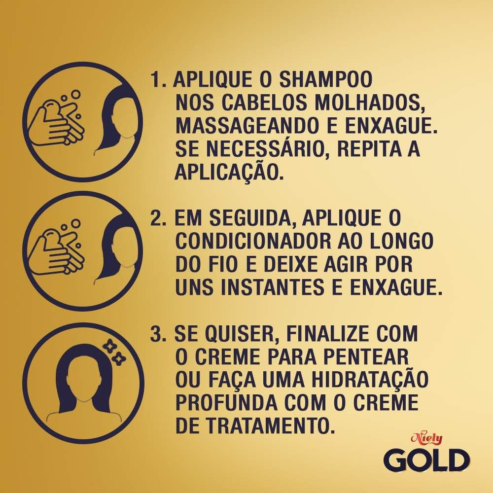 Shampoo Niely Gold Nutrição Mágica – 275ml O Shampoo Niely Gold Nutrição Mágica foi criado especialmente para cabelos opacos, secos ou sem vida, oferecendo uma limpeza suave combinada com nutrição profunda desde a primeira aplicação. Sua fórmula rica em óleos e ativos poderosos devolve o brilho, maciez e vitalidade dos fios, promovendo um toque mágico de transformação capilar no dia a dia. Principais Características Óleo de Argan e Cártamo Ricos em ácidos graxos e antioxidantes, esses óleos nutrem profundamente os fios, restaurando a saúde capilar e proporcionando um brilho intenso e duradouro. Tecnologia MaxQueratina+ Contém um complexo exclusivo de aminoácidos que fortalece a estrutura dos cabelos, ajudando a reduzir a quebra e a reconstruir os fios fragilizados. Textura cremosa e limpeza equilibrada Limpa delicadamente sem ressecar, mantendo os cabelos leves, nutridos e prontos para absorver melhor os tratamentos posteriores. Benefícios Nutre profundamente os fios Restaura a maciez e o brilho natural dos cabelos Fortalece a fibra capilar e reduz a quebra Ideal para cabelos ressecados ou danificados Pode ser usado diariamente Diferenciais do Produto Combinação de óleos nutritivos: Argan + Cártamo para nutrição intensiva Ação reparadora com brilho instantâneo Fórmula leve e eficaz para todos os tipos de cabelo Custo-benefício excelente com resultado de salão em casa Especificações Técnicas Peso: 275ml Instruções de Uso Aplique o shampoo nos cabelos molhados, massageando suavemente o couro cabeludo até formar espuma. Enxágue bem. Se necessário, repita a aplicação. Para melhores resultados, utilize a linha completa Niely Gold Nutrição Mágica. Avisos e Precauções Uso externo. Evite contato com os olhos. Em caso de contato, enxágue com água em abundância. Mantenha fora do alcance de crianças. Em caso de irritação, suspenda o uso e procure orientação médica. O que está incluso? 01 Shampoo Niely Gold Nutrição Mágica – 275ml ---- DÚVIDAS FREQUENTES ---- Os produtos são originais? Sim. Todos os nossos produtos são originais. Emitem nota fiscal? Sim. Emitimos nota fiscal para todos os pedidos.