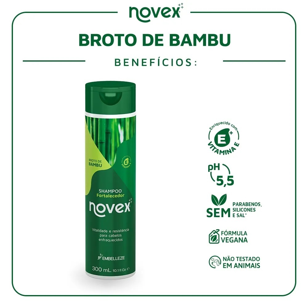 Sobre o produto: Olá, força e vitalidade! Quando os cabelos vão perdendo o brilho, a vida e a maciez, você já sabe, né? O Broto de Bambu é perfeito para te ajudar! Sua ação hidratante e antioxidante, graças à Vitamina E, promove um verdadeiro rejuvenescimento dos fios. Adeus, fraqueza! Indicação: Hidratação e maciez para cabelos enfraquecidos. Indicado para todos os tipos de cabelos, especialmente para cabelos cacheados e crespos. Ação: Cansada de ver seus cabelos sem vida, opacos e quebradiços? Chega de sofrer! O Shampoo Novex Broto de Bambu chegou para revolucionar seus cuidados capilares, oferecendo hidratação e limpeza profunda, revitalização intensa e força renovada, tudo isso com uma fórmula rica em brotos de bambu e vitamina E, livre de sal e parabenos. Ativos: Broto de Bambu e vitamina E. Benefícios: Hidratação profunda e duradoura Fortalecimento e crescimento acelerado Fios mais resistentes Brilho natural e luminosidade Fios macios e sedosos Livre de sal e parabenos Resultado: Cabelos mais fortes e resistentes à quebra Crescimento capilar acelerado Fios mais resistentes Hidratação profunda e duradoura Brilho natural e luminosidade Cabelos macios, sedosos e com toque suave Modo de Uso: Aplique o Shampoo Novex Broto de Bambu nos cabelos úmidos, massageando suavemente o couro cabeludo. Deixe agir por 2 minutos. Enxágue abundantemente com água. Para um tratamento ainda mais completo, combine o Shampoo Novex Broto de Bambu com os outros produtos da linha Novex Broto de Bambu: Condicionador Novex Broto de Bambu: desembaraça, hidrata e protege os fios durante o dia. Creme de Tratamento Novex Broto de Bambu: hidratação profunda que nutre e fortalece os fios. Creme para Pentear Novex Broto de Bambu: facilita o penteado e protege os fios contra os danos externos.