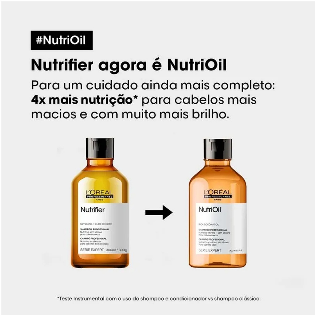 SHAMPOO NUTRI OIL LORÉAL PROFESSIONNEL SERIE EXPERT 300ML Shampoo para cabelos ressecados. L'Oréal Professionnel NutriOil resgata a nutrição e a hidratação perdida para devolver a vitalidade aos fios secos. O Shampoo L'Oréal Professionnel NutriOil foi desenvolvido para agir nos principais sinais de fragilidade dos cabelos deficientes de nutrição e hidratação: a perda de brilho, embaraço dos fios e aspereza. Sua fórmula forma um filme protetor que alinha as cutículas e deixa o cabelo mais suave ao toque, protegido da quebra e com brilho radiante. A linha Nutrifier agora é NutriOil, um tratamento nutritivo intensivo contra o ressecamento, que nas formulações o Óleo de Coco e o Óleo de Soja para garantir cabelos macios e com brilho. Seu uso entrega hidratação e redução da perda proteica da fibra capilar, o que permite resultados mais duradouros e sem pesar.
