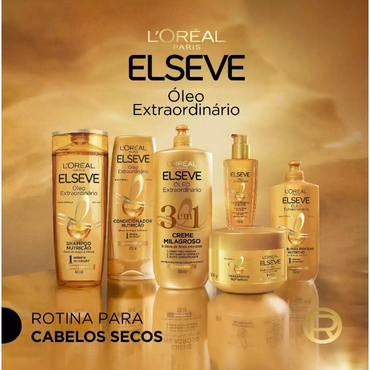 SHAMPOO NUTRIÇÃO ÓLEO EXTRAORDINÁRIO ELSEVE 200ML Um cabelo seco parece estar sem vida, pois ele está opaco, sem brilho e tem um toque áspero. O segredo dos óleos de flores preciosas para uma nutrição perfeita & uma leveza infinita estão na linha Elseve Óleo Extraordinário Nutrição. O Elseve Óleo Extraordinário Nutrição com sua textura ultrafina e leve, é enriquecido em Micro-Óleos de Flores Preciosas que agem para combater o cabelo seco e sem brilho. Reconstrói a fibra, fazendo com que seu cabelo tenha uma nutrição perfeita, leveza infinita e um brilho excepcional. Resultado Os cabelos secos ficam cheios de vida e sem pesar. Sublimes em todos os ângulos. Modo de Uso Aplique o shampoo nos cabelos molhados e massageie suavemente. Enxágue. Repita a operação se necessário.