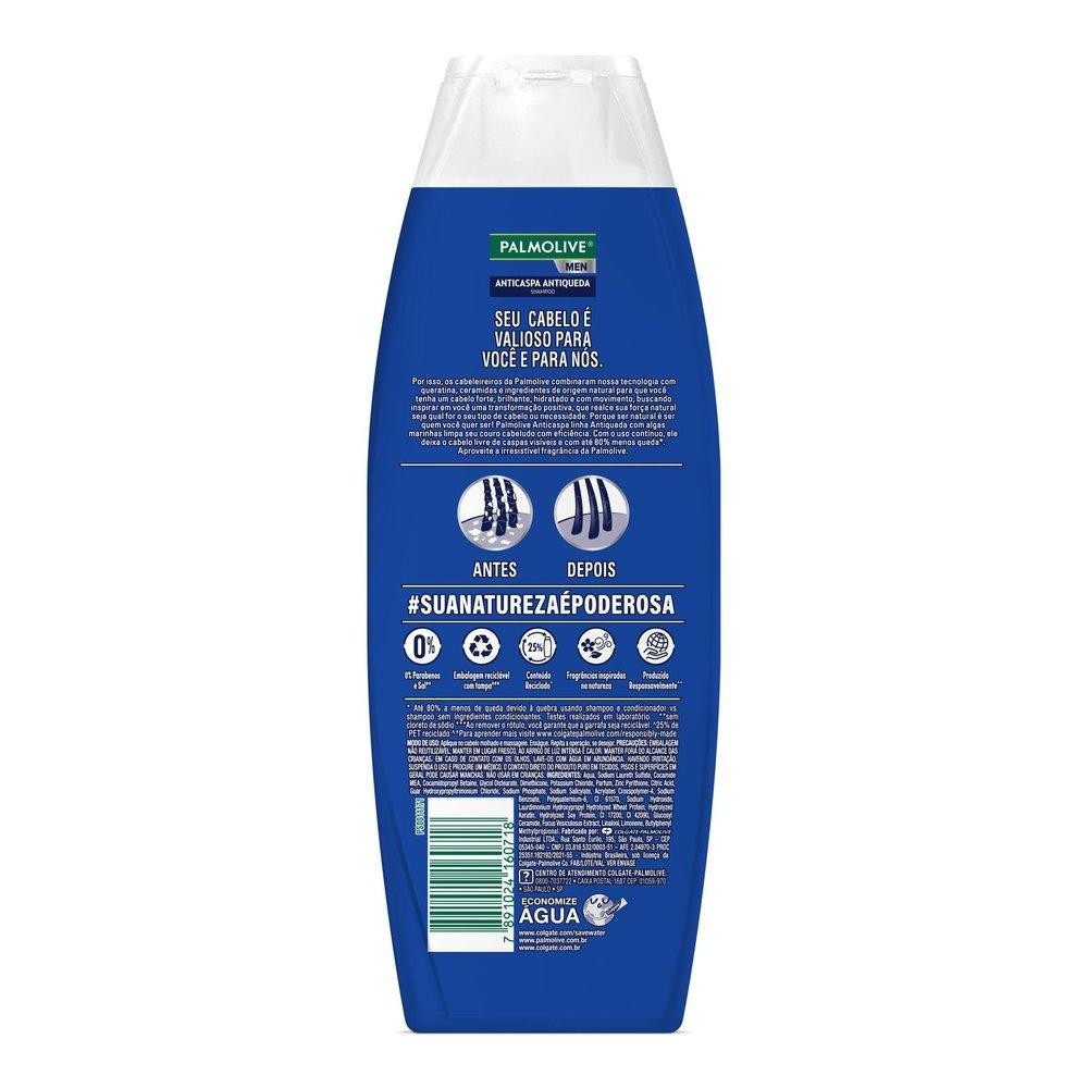 Shampoo Palmolive For Men Anticaspa combate a caspa desde o 1º uso e reduz a queda em 80%.Os cabelos ganham vitalidade e uma agradável fragrância que te acompanha. Benefícios para você: Fórmula com extrato de algas e climbazone. Fragrância inspirada pelos homens. 80% menos queda por quebra de cabelo. Dermatologicamente testado.