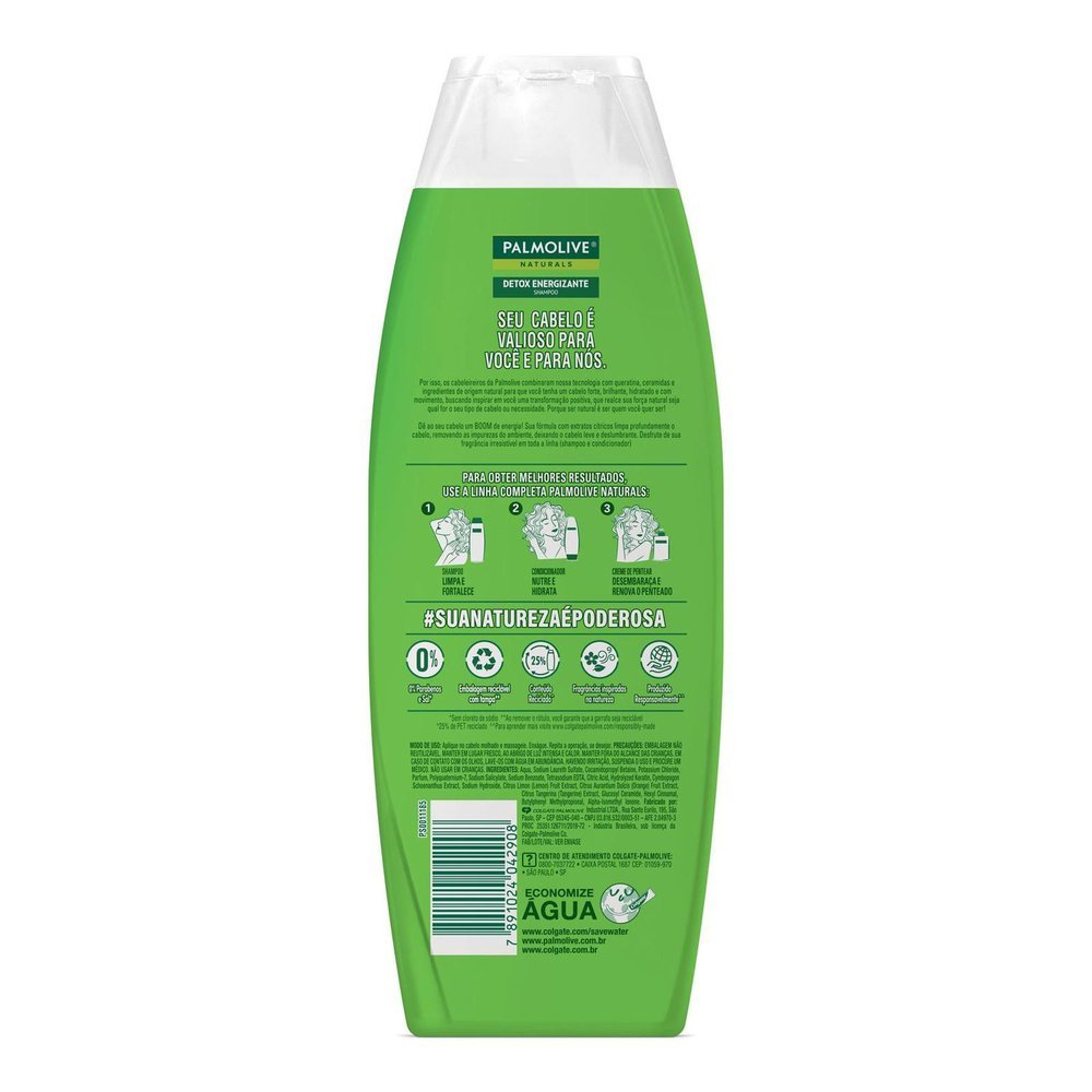 SHAMPOO PALMOLIVE NATURALS DETOX ENERGIZANTE Com extratos cítricos. Sem Silicones / Sem Sal. Limpeza profunda para recuperar o brilho e a leveza. Sua fórmula enriquecida com Extratos Cítricos vai limp