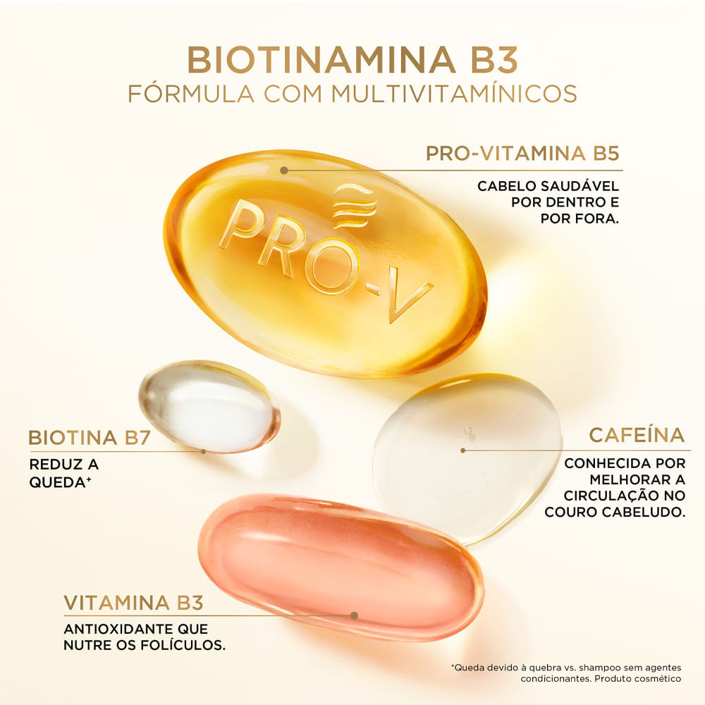 O Shampoo Pantene Pro-V Miracles Biotinamina B3 510ml foi desenvolvido para reduzir a queda dos fios devido à quebra, fortalecer a fibra capilar e promover um cabelo mais saudável desde a raiz. Sua fórmula contém um complexo multivitamínico composto por Biotina B7, Vitamina B3 e Pro-Vitamina B5, garantindo nutrição profunda e resistência para os cabelos fracos e quebradiços. Com pH balanceado e livre de parabenos, proporciona limpeza eficaz e condicionamento intenso sem comprometer a saúde capilar. Limpa suavemente os fios e o couro cabeludo, removendo impurezas sem ressecar. Além disso, fortalece a fibra capilar e reduz até 95% da queda devido à quebra.Benefícios: Reduz até 95% da queda devido à quebra; Fortalece os fios desde a raiz; Complexo multivitamínico: Biotina B7 + Vitamina B3 + Pro-Vitamina B5; pH balanceado e fórmula sem adição de parabenos; Promove um couro cabeludo saudável e estimula o crescimento capilar; Cabelos mais macios, brilhantes e resistentes à quebra. Modo de usar: Aplique o shampoo nos cabelos molhados, massageando suavemente. Enxágue abundantemente e se necessário, repita o processo.Sobre a marca: Pantene foi lançada na Europa em 1947, o nome se refere a origem do produto o Panthenol que é o nome cientifico da vitamina B5. A marca possui produtos com características nunca vistas no mercado, pois são fabricados com uma fórmula 7 vezes mais efetiva. Seus produtos possuem tecnologia Pro-V que fortalece e repara o fio evitando a quebra e reduzindo em até 98% a queda, isso em apenas uma semana.