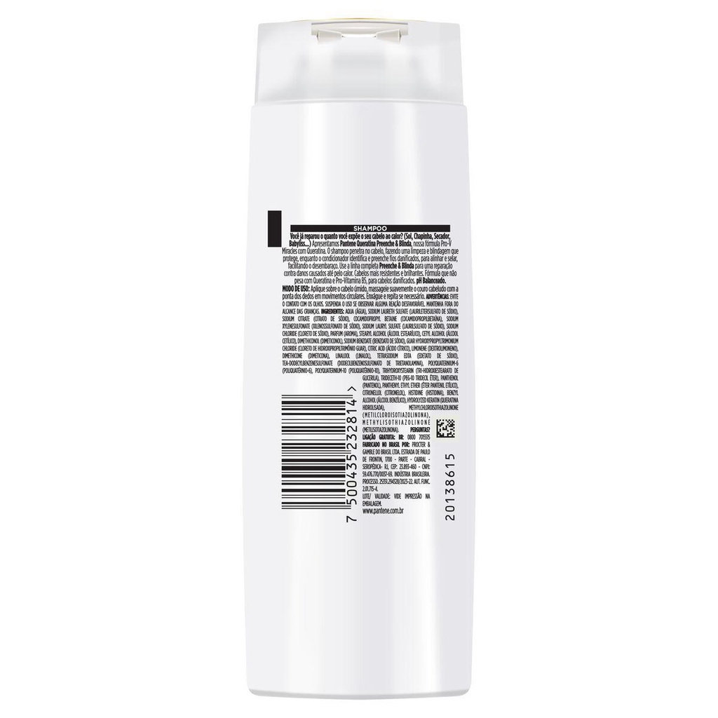 Você já reparou o quanto você expõe o seu cabelo ao calor? (Sol, Chapinha, Secador, Babyliss...). Apresentamos o shampoo e condicionador Pantene Queratina Preenche & Blinda, nossa fórmula Pro-V Miracles com Queratina.O shampoo penetra no cabelo, fazendo uma limpeza e blindagem que protege, enquanto o condicionador identifica e preenche fios danificados, para alinhar e selar, facilitando o desembaraço. Use o shampoo e condicionador e a linha completa Preenche & Blinda para uma reparação contra danos causados até pelo calor. Cabelos mais resistentes e brilhantes.Fórmula que não pesa com Queratina e Pro-Vitamina B5, para cabelos danificados. pH balanceado.Short DescriptionVocê já reparou o quanto você expõe o seu cabelo ao calor? (Sol, Chapinha, Babyliss...). Apresentamos Pantene Queratina Preenche & Blinda, nossa fórmula Pro-V Miracles com Queratina e Pro-Vitaminas B5. Fórmula que não pesa.O shampoo penetra no cabelo, fazendo uma limpeza e blindagem que protege, enquanto o condicionador identifica e preenche fios danificados, para alinhar e selar, facilitando o desembaraço. Use a linha completa de shampoo e condicionador Preenche & Blinda para uma reparação contra danos causados até pelo calor.Cabelos mais resistentes e brilhantes. • O shampoo penetra no cabelo, fazendo uma limpeza e blindagem que protege • O condicionador identifica e preenche fios danificados, para alinhar e selar, facilitando o desembaraço • A linha completa Preenche & Blinda repara o contra danos, causados até pelo calor • Cabelos mais resistentes e brilhantes • Contém Queratina e Pro-Vitaminas B5, para cabelos danificados • pH balanceado • Fórmula que não pesa