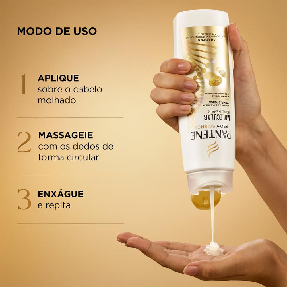 O Shampoo Pantene Pro-V Science Molecular Bond Repair 300ml foi desenvolvido para cabelos ressecados, danificados e frágeis. Sua fórmula exclusiva com Amino-Peptídeo e Complexo Pro-Vitamina atua em nível molecular, preparando os fios para absorver agentes reparadores, fortalecendo e protegendo sua estrutura. Além disso, é ideal para cabelos danificados por química, calor, poluição ou agressões externas. Oferece até 5x mais força, protegendo contra danos futuros. Benefícios:Limpeza profunda sem ressecar os fios;Repara cabelos danificados em nível molecular;Oferece até 5x mais força° contra a quebra;Deixa os fios saudáveis desde o primeiro uso;Cabelos mais fortes a cada aplicação contínua;Fórmula sem sal (sem adição de NaCl);Textura leve, ideal para uso diário;Recomendado para todos os tipos de danos: químico, térmico, mecânico e ambiental. Ativos Principais:Amino-Peptídeo: fortalece a estrutura interna dos fios.Complexo Pro-Vitamina: nutre e protege em profundidade.Pantenol, Carnosina e Histidina: atuam na reparação e regeneração capilar. Modo de usar: Aplique o shampoo nos cabelos molhados, massageando suavemente. Enxágue abundantemente e se necessário, repita o processo. Sobre a marca: Pantene foi lançada na Europa em 1947, o nome se refere a origem do produto o Panthenol que é o nome cientifico da vitamina B5. A marca possui produtos com características nunca vistas no mercado, pois são fabricados com uma fórmula 7 vezes mais efetiva. Seus produtos possuem tecnologia Pro-V que fortalece e repara o fio evitando a quebra e reduzindo em até 98% a queda, isso em apenas uma semana.