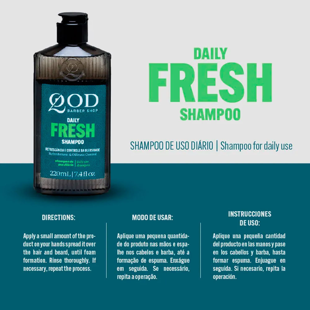 Shampoo para cabelos oleosos - THE DAILY FRESH 220ml - QOD BARBER SHOP O QBS The Daily Fresh Shampoo foi desenvolvido especialmente para estar presente na rotina do homem. O shampoo masculino proporci