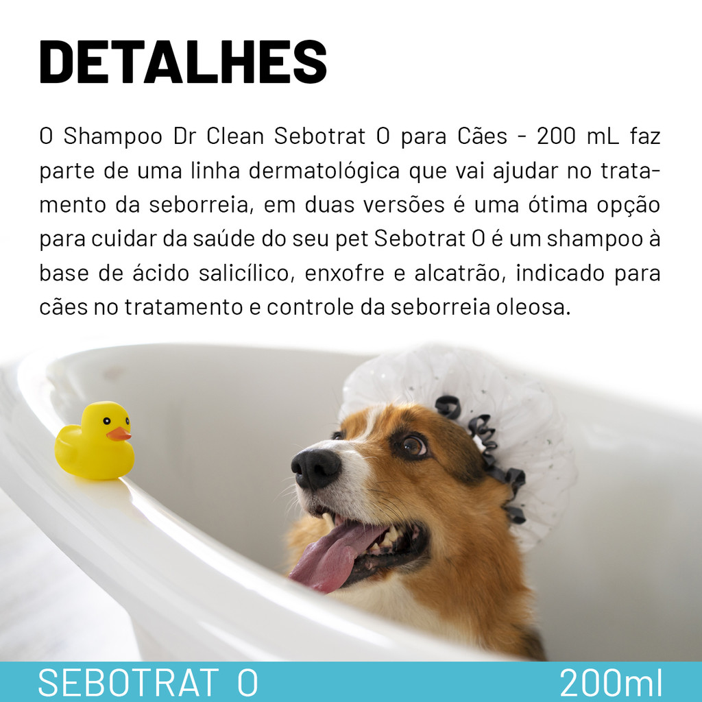 Shampoo Sebotrat O Dr. Clean 200 ml - Agener Unio O shampoo Sebotrat O utilizado para auxiliar no problema dermatolgico do seu cozinho. Foi especialmente formulado para o combate e controle da seborreia oleosa dos ces, pois atua na remoo das descamaes e crostas da pele, regularizando a secreo sebcea, restaura a microbiota cutnea, alm de apresentar ao antimicrobiana, anti-inflamatria e antipruriginosa. A frmula enriquecida com vitaminas contribui para o embelezamento da pele e pelagem do animal. O ph especialmente balanceado para ces, permitindo uso frequente. Indicaes: indicado no controle e tratamento sintomtico da seborreia oleosa, com qualquer grau de intensidade. Modo de uso: Aplique no pelo molhado e massageie por todo o corpo do animal. Aps o ensaboamento total, aguarde o produto agir por 10 minutos e enxgue bem a seguir. Aplicar o xampu 2 a 3 vezes por semana, ou a critrio do mdico veterinrio. Apresentao: Frasco plstico contendo 200 ml Uso: Tpico Indicao: Proteo, Preveno e tratamento Tipo: Dermatolgico e teraputico Idade: Snior, adultos e filhotes Pet: Ces