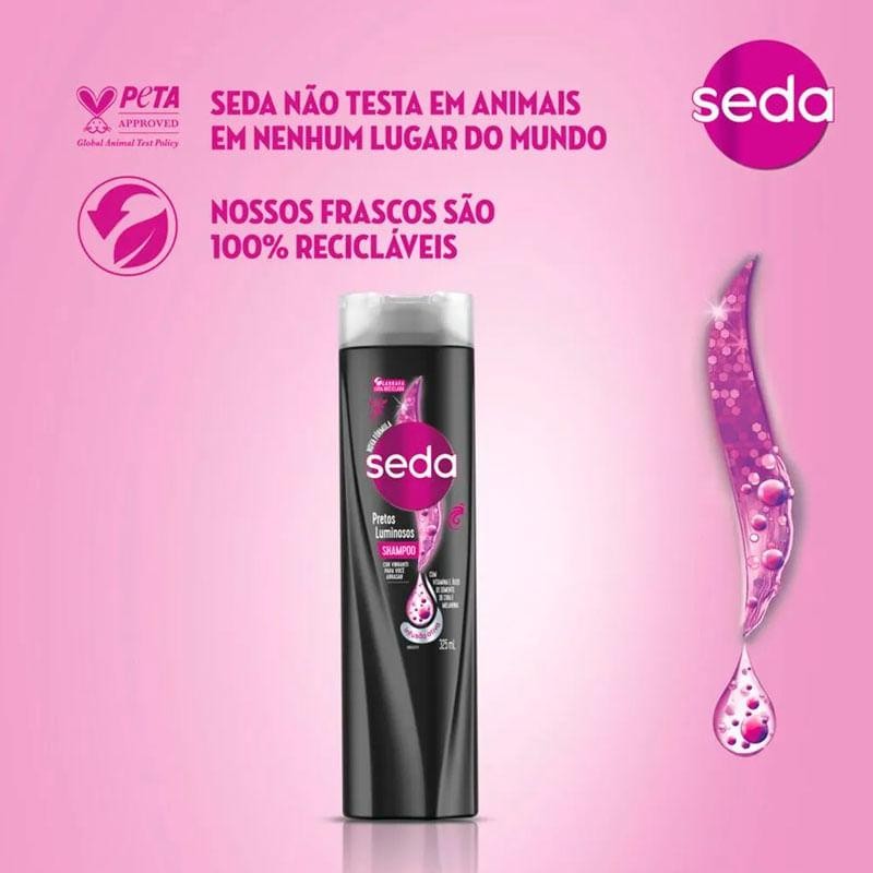 Shampoo Seda Pretos Luminosos 325ml – Brilho e Hidratação para Cabelos Pretos O Shampoo Seda Pretos Luminosos 325ml foi desenvolvido especialmente para realçar a beleza dos cabelos pretos. Sua fórmula exclusiva com melanina reaviva a cor natural dos fios, proporcionando hidratação, maciez e muito brilho. Um cuidado diário que deixa seus cabelos pretos ainda mais vivos e radiantes! Benefícios - Reaviva e realça os fios pretos. - Fórmula com melanina, que nutre e hidrata profundamente. - Deixa o cabelo macio e com brilho intenso. - Ajuda a manter a vitalidade e luminosidade dos fios. Diferenciais - Exclusiva tecnologia com melanina, que intensifica a cor dos cabelos pretos. - Proporciona hidratação sem pesar. - Desenvolvido para manter os fios nutridos, luminosos e cheios de vida. Como usar 1. Aplique o shampoo nos cabelos molhados. 2. Massageie suavemente até formar espuma. 3. Enxágue bem e, se necessário, repita a aplicação. 4. Para melhores resultados, use junto com o Condicionador Seda Pretos Luminosos. Dica de uso: Para melhores resultados, use a linha completa de Seda Pretos Luminosos diariamente. Descubra a linha completa de produtos Seda! Cuide dos seus cabelos com qualidade, tecnologia e os melhores preços. Encontre shampoos, condicionadores, máscaras de tratamento e cremes para pentear Seda, desenvolvidos para todos os tipos de cabelo.