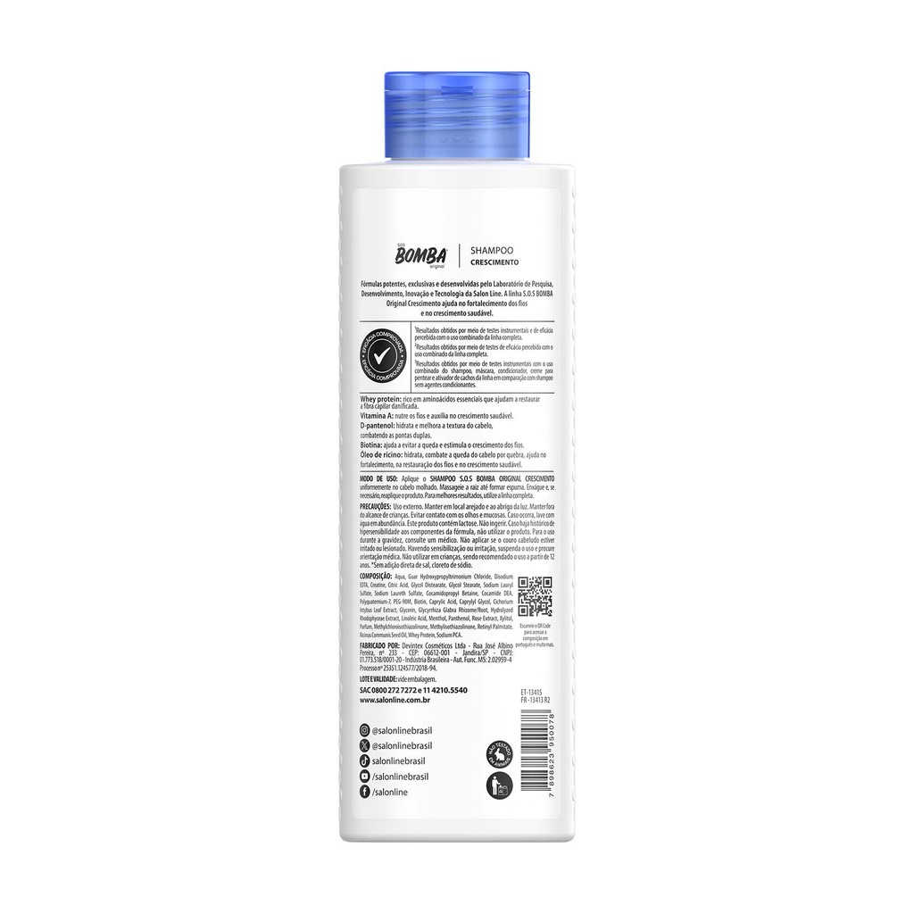 O Shampoo S.O.S Bomba Original conta com fórmula dermatologicamente testada e rica em ingredientes que garantem crescimento capilar comprovado em 15 dias, cabelos mais fortes, recuperados e saudáveis. INDICAÇÕES Para quais tipos de cabelo? Para todos os tipos de cabelos. Qual a indicação? Cabelos fracos e cabelos quebradiços. Pode usar a partir de quantos anos? A partir de 12 anos. ATIVOS Quais os principais ativos? Whey protein: rico em aminoácidos essenciais que restauram a fibra capilar danificada. Vitamina A: fortalece os fios e auxilia no crescimento saudável. D-pantenol: hidrata e melhora a textura das fibras capilares, combatendo as pontas duplas. Biotina: ajuda a prevenir a queda, estimula o crescimento e fortalece os fios. Óleo de rícino: hidrata, combate a queda de cabelo por quebra, fortalece e recupera profundamente os fios, além de auxiliar no crescimento saudável. MODO DE USO Qual a melhor forma de usar? Aplique uniformemente o Shampoo Bomba Original no cabelo molhado. Massageie a raiz até formar espuma. Enxágue. Dicas de uso Para melhores resultados, utilize o Condicionador Salon Line S.O.S Bomba, o Creme para Pentear S.O.S, a máscara de hidratação e o tônico fortalecedor da linha S.O.S Bomba Original da Salon Line. CARACTERÍSTICAS É produto vegano? O Shampoo S.O.S Bomba Original não é vegano. É liberado? O Shampoo S.O.S Bomba Original não é liberado.
