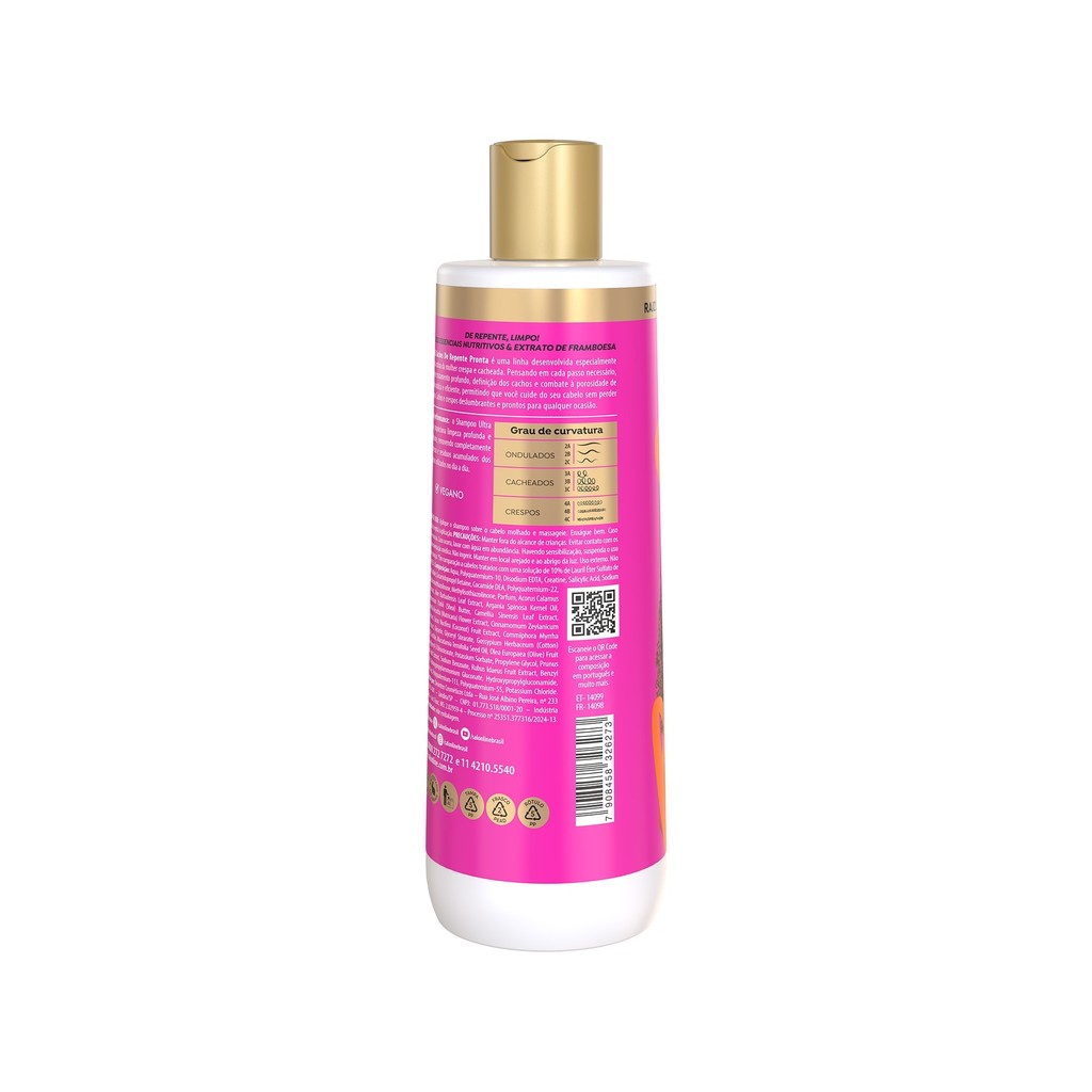 O Shampoo Ultra Gloss S.O.S Cachos De Repente Pronta! proporciona 48h de limpeza profunda e hidratante, removendo completamente impurezas e resíduos acumulados dos produtos utilizados no dia a dia. <>INDICAÇÕES$& Para quais tipos de cabelo? Cabelos cacheados e crespos. Qual a indicação? Cabelos porosos e sem brilho. Pode usar a partir de quantos anos? A partir de 12 anos. <>ATIVOS$& Quais os principais ativos? Sua fórmula é enriquecida com óleos essenciais nutritivos e extrato de framboesa. <>MODO DE USO$& Qual a melhor forma de usar? Aplique o shampoo sobre o cabelo molhado e massageie. Enxágue bem. Caso necessário, repita a aplicação. <>CARACTERÍSTICAS$& É produto vegano? O Shampoo Ultra Gloss S.O.S Cachos De Repente Pronta! é vegano. É liberado? O Shampoo Ultra Gloss S.O.S Cachos De Repente Pronta! não é liberado.