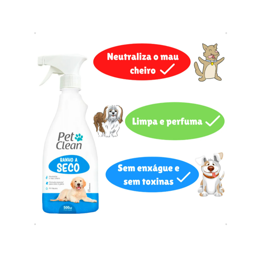Dê banho no seu peludinho sem se molhar! Cachorros e gatos limpos e cheirosos são grandes desejos de todos os amantes de animais, não é mesmo? Ainda mais quando conseguimos dar banho em nossos bichinhos sem utilizar água! Na correria do dia a dia nem sempre temos tempo para dar banhos frequente em nossos amiguinhos e ainda por cima, banhos super frequentes não são indicados. O Banho Seco para Cães e Gatos da Pet Clean é uma ótima opção para você que quer ver o seu pet sempre limpo mas não tem tempo ou condições de dar banho constantes! Banho a seco é uma maneira prática, simples e eficaz para auxiliar na limpeza e bom cheiro de cães e gatos! Benefícios do Banho a Seco Pet Clean (Cachorro OU Gato): Neutraliza odores. Dispensa uso de água e enxague. Bons aromas para o seu animal. Fácil aplicação na forma de spray. Contribui para pelos brilhosos e macios. PH Neutro: Não agride a pele do seu animal. Informações Técnicas: Produto: Banho a Seco para Cães e Gatos Pet Clean - 500 ml Marca: Pet Clean Tipo: Higiene Animal: Cachorros e Gatos Porte: Pequeno, Médio e Grande. Acima de 3 meses. Raça Específica: Não Itens Inclusos: 1x Banho a Seco para Cães e Gatos Pet Clean - 500 ml Apresentação: Frasco em Plástico Composição: Propilenoglicol, Álcool Neutro, Fragância, Silicone, Emoliente, Neutralizador de Odor, Veículo Q.S.P. MODO DE USAR Aplique o produto diretamente no pelo do pet (distância de aproximadamente 10 a 15 cm). Espalhe por toda a pelagem com o auxílio de um pano limpo e seco, retirando o excesso. Não é necessário enxaguar. Uso externo. PRECAUÇÕES Evite contato com os olhos e mucosas do animal. Manter longe de alimentos e produtos domésticos. Manter em locais secos, fora do alcance de crianças e animais domésticos. Não utilizar em filhotes com menos de 2 meses de vida. Observação: O banho a seco não substitui um banho completo com água. PERGUNTAS FREQUENTES POSSO DAR BANHO A SECO EM FILHOTES? O Banho a Seco da Pet Clean é indicado para todas as idades, inclusive filhotes acima de 3 meses. O BANHO A SECO SUBSTITUI O BANHO NORMAL? Não! Banhos a seco são opções alternativas para limpeza e higiene de cães e gatos, sendo que o banho convencional com água, shampoo e enxague é sempre indicado por ser mais completo. O BANHO A SECO É APLICADO DA MESMA FORMA PARA CÃES E GATOS? Sim! A aplicação é a mesma para ambos animais. O QUE FAZER SE O BANHO A SECO TOCAR OS OLHOS? Se o Banho a Seco vier a tocar os olhos, recomendamos que enxague com água em abundância. Salientamos que o Banho a Seco tem PH neutro, o que não será danoso aos olhos do animal. No entanto, recomendamos sempre evitar o contato do produto com os olhos, orelhas e partes íntimas dos animais. O BANHO A SECO DA PET CLEAN É HIPOALÉRGICO? Não, apesar de não possuir componentes nocivos e tóxicos aos animais, o produto não é especial para cães alérgicos. O QUE ACONTECE SE O CACHORRO OU GATO LAMBER O PRODUTO? Não indicamos o consumo do produto para nenhum animal. Porém, eventualmente caso o animal venha a ingerir o produto, não haverá nenhum risco para a saúde do mesmo. Mas, caso algum comportamento diferente ocorra, indicamos a consulta de um médico veterinário de sua confiança.