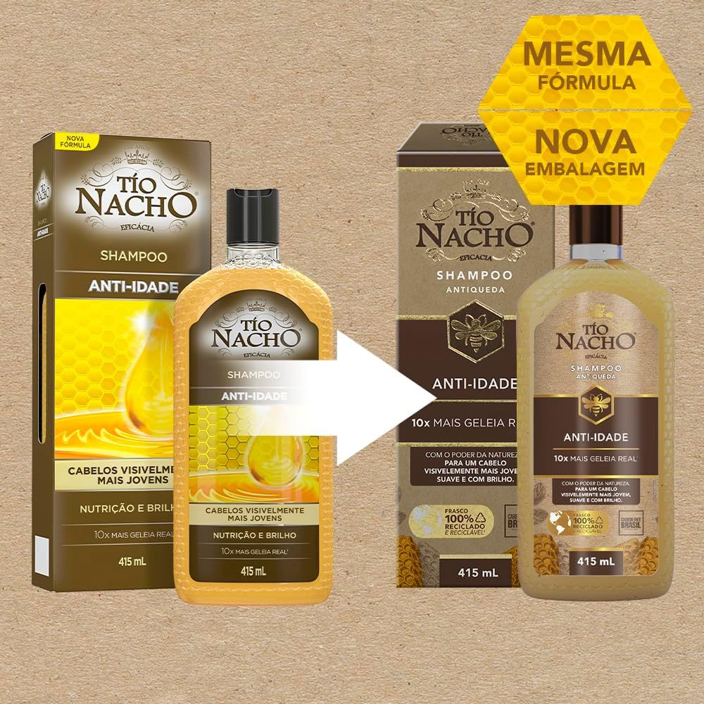 Shampoo Tío Nacho Antiqueda Anti-Idade com 415ml O Shampoo Tío Nacho Antiqueda Anti-Idade foi desenvolvido especialmente para fortalecer os cabelos enfraquecidos, ajudando a combater os sinais de envelhecimento capilar. Sua fórmula exclusiva com geleia real, jalea real e ativos naturais oferece nutrição profunda desde a raiz, promovendo cabelos mais fortes, saudáveis e com aparência rejuvenescida. Principais Características: • Fórmula com Geleia Real e Jalea Real: Nutre intensamente o couro cabeludo, estimulando o crescimento saudável dos fios. • Enriquecido com ativos antioxidantes: Auxilia na redução dos sinais de envelhecimento capilar, como afinamento e opacidade. • Ação Antiqueda comprovada: Fortalece o cabelo desde a raiz, reduzindo a queda causada pela quebra. Benefícios: - Redução visível da queda de cabelo - Fios mais resistentes, com brilho e vitalidade - Auxilia no combate ao envelhecimento capilar - Hidratação e nutrição desde a raiz até as pontas - Sensação de limpeza e leveza após o uso Diferenciais do Produto: - Combinação de ingredientes naturais com ação antiquebra e antioxidante - Indicado especialmente para cabelos enfraquecidos com sinais de idade - Textura leve e fragrância suave - Marca reconhecida em cuidados capilares com tradição em fórmulas à base de ingredientes naturais Especificações Técnicas: • Peso: 480 g (produto cheio com embalagem) • Volume: 415 ml Instruções de Uso: - Aplique o shampoo nos cabelos molhados, massageando suavemente o couro cabeludo com as pontas dos dedos até formar espuma. - Enxágue bem. - Para melhores resultados, utilize com outros produtos da linha Tío Nacho. Avisos e Precauções: - Uso externo. - Evite contato com os olhos. Em caso de contato, enxágue abundantemente. - Mantenha fora do alcance de crianças. - Em caso de irritação, suspenda o uso e procure orientação médica. O que está incluso? • 01 Shampoo Tío Nacho Antiqueda Anti-Idade com 415ml ---- DÚVIDAS FREQUENTES ---- Os produtos são originais? Sim. Todos os nossos produtos são originais. Emitem nota fiscal? Sim. Emitimos nota fiscal para todos os pedidos.