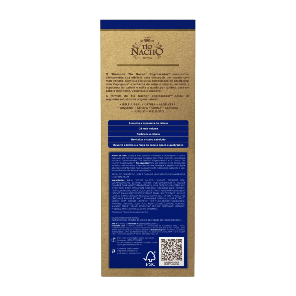Shampoo Tio Nacho Antiqueda Engrossador - 415ml Principais Características - Fórmula com Geleia Real e Extratos Naturais: Nutre e fortalece os fios desde a raiz, ajudando a reduzir a queda capilar causada pela quebra. - Efeito Engrossador: Aumenta a espessura dos fios, proporcionando um cabelo mais denso e volumoso. - Hidratação e Brilho: Mantém os cabelos saudáveis, macios e com um brilho natural. Benefícios - Auxilia na redução da queda capilar. - Fortalece os fios e previne a quebra. - Proporciona mais volume e densidade ao cabelo. - Promove hidratação sem pesar os fios. Diferenciais do Produto - Combinação exclusiva de ingredientes naturais. - Livre de parabenos. - Indicado para cabelos finos e frágeis. Especificações Técnicas - Peso: 415ml. Instruções de Uso - Aplique o shampoo nos cabelos molhados. - Massageie suavemente o couro cabeludo até formar espuma. - Enxágue bem e, se necessário, repita a aplicação. Avisos e Precauções - Uso externo. Evite contato com os olhos; em caso de contato, enxágue com água em abundância. - Manter fora do alcance de crianças. - Em caso de irritação, suspenda o uso e consulte um dermatologista. O que está incluso? - 1 Shampoo Tio Nacho Antiqueda Engrossador - 415ml. ---- DÚVIDAS FREQUENTES ---- Os produtos são originais? Sim. Todos os nossos produtos são originais. Emitem nota fiscal? Sim. Emitimos nota fiscal para todos os pedidos.