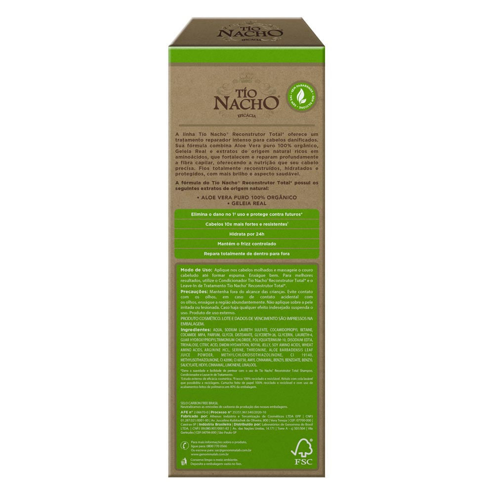 SHAMPOO TÍO NACHO RECONSTRUTOR TOTAL Sua fórmula combina Aloe Vera puro 100% orgânico, Geleia Real e extratos de origem natural ricos em aminoácidos, que fortalecem e reparam profundamente a fibra cap