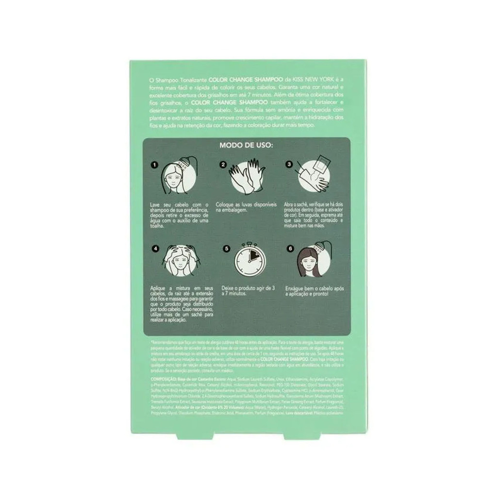 Descrição: O Shampoo Tonalizante Kiss New York Color Change da tchau aos grisalhos em apenas 3 minutos usando Color Change Shampoo! Com fórmula de ação rápida, o shampoo tonalizante da Kiss NY garante 100% da cobertura dos grisalhos em um período de apenas 3 a 7 minutos. Além de uma fórmula vegana, não testada em animais e livre de amônia e parabenos, o produto ainda é rico em Ginseng, ativo que fortalece a raiz do cabelo e elimina as toxinas e também conta com Extratos Naturais que promovem o crescimento dos fios e ajudam a reter a cor do cabelo por mais tempo. É indicado para todos os tipos de cabelos, inclusive os quimicamente tratados e sua fórmula garante mínima transferência para toalhas e roupas. MODO DE USAR: 1 - Antes de tudo, faça o teste de alergia: misture a base com o ativador e aplique no antebraço ou atrás da orelha. Aguarde 48h. Sem reação? Tá liberado! Sentiu ardor, coceira ou irritação? Enxágue bem e não utilize o produto. 2 - Lave bem os cabelos com shampoo de sua preferência para eliminar resíduos, oleosidade ou sujeira. Isso garante que o Color Change atue com mais eficácia. Depois, retire o excesso de água. Coloque as luvas que acompanham o produto para proteger suas mãos e evitar manchas. 3 - Abra o sachê, misture a base com o ativador até ficar homogêneo e aplique nos fios da raiz às pontas, massageando bem. Deixe agir de 3 a 7 minutos e enxágue totalmente. Pronto, fios renovados e grisalhos cobertos com resultado incrível! USO EXTERNO. MANTENHA FORA DO ALCANCE DAS CRIANÇAS. Conteúdo da embalagem: Contém 3 sachês de 30mL (cada sachê possui 15mL de base de cor e 15 mL de ativador de cor) e 3 pares de luvas descartáveis.