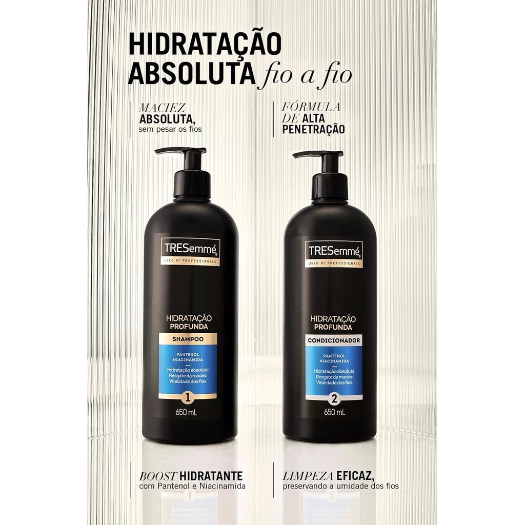O shampoo TRESemmé Hidratação Profunda foi desenvolvido com Pantenol e Niacinamida, conhecidos por seus benefícios capilares, para um boost hidratante em todos os tipos de cabelos. A linha oferece 1 - Promove hidratação profunda do cabelo: com fórmula ultra-hidratante de alta penetração, a linha entrega uma hidratação profunda, sem pesar os fios. 2 - Restaura a maciez dos fios: a linha TRESemmé Hidratação Profunda é um tratamento de hidratação superior que restaura de forma eficaz e instantânea a maciez e toque suave das fibras. 3 - Contém Pantenol e Niacinamida, conhecidos por seus diversos benefícios capilares: com a combinação exclusiva do pantenol e niacinamida com alta penetração capilar a linha entrega o máximo poder hidratante. Modo de Uso Aplique o shampoo nos cabelos molhados, massageando-os suavemente. Enxágue bem.
