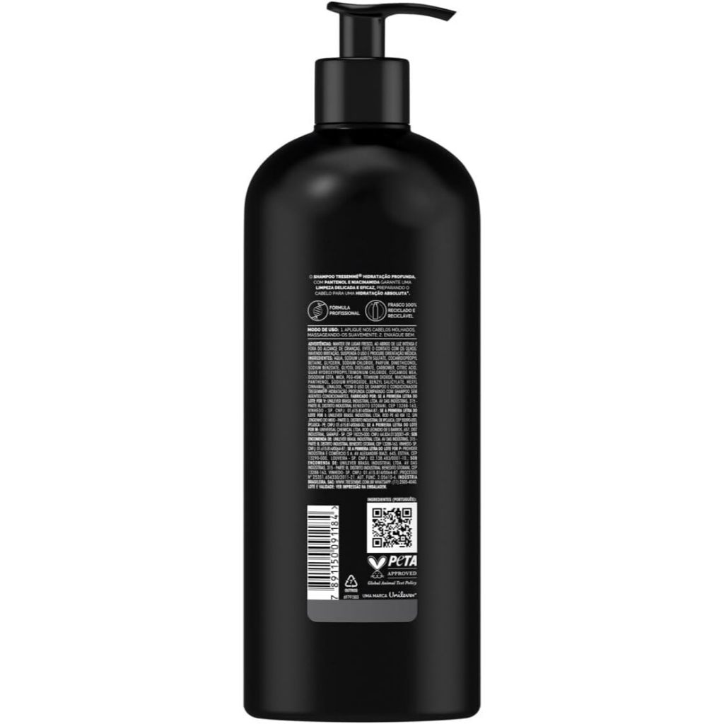 Shampoo Tresemmé Hidratação Profunda 650ml O Shampoo Tresemmé Hidratação Profunda foi desenvolvido para restaurar a maciez e o brilho dos cabelos secos e ressecados, oferecendo hidratação intensa desde a primeira aplicação. Com uma fórmula enriquecida com ácido hialurônico e vitamina E, proporciona uma limpeza eficaz enquanto nutre profundamente os fios, deixando-os sedosos, saudáveis e com movimento natural. Principais Características: Enriquecido com Ácido Hialurônico Um poderoso ativo hidratante que retém a umidade natural dos fios, garantindo hidratação prolongada e melhor elasticidade capilar. Contém Vitamina E Ingrediente antioxidante que combate os danos causados por agressões externas e contribui para a saúde do couro cabeludo e dos fios. Limpeza Suave com Efeito Nutritivo Remove impurezas de forma delicada sem ressecar os cabelos, preparando os fios para receber o condicionamento ideal. Benefícios: Hidratação profunda desde o primeiro uso Cabelos mais macios, alinhados e com brilho Fios soltos, leves e com movimento natural Ideal para cabelos secos ou danificados Limpeza eficiente com sensação de frescor e nutrição Diferenciais do Produto: Fórmula profissional com ingredientes de alto desempenho Combinação de ácido hialurônico e vitamina E para hidratação e proteção Livre de parabenos e corantes Testado dermatologicamente Embalagem econômica de 650ml, ideal para uso diário e familiar Especificações Técnicas: Peso: 650ml Instruções de Uso: Aplique nos cabelos molhados, massageando suavemente o couro cabeludo com as pontas dos dedos até formar espuma. Enxágue completamente. Para melhores resultados, utilize em conjunto com o Condicionador Tresemmé Hidratação Profunda. Avisos e Precauções: Uso externo. Evite contato com os olhos. Em caso de contato, enxágue imediatamente com água. Manter fora do alcance de crianças. Conservar em local fresco, seco e ao abrigo da luz. Em caso de irritação, suspenda o uso e procure orientação médica. O que está incluso? 1 unidade de Shampoo Tresemmé Hidratação Profunda 650ml ---- DÚVIDAS FREQUENTES ---- Os produtos são originais? Sim. Todos os nossos produtos são originais. Emitem nota fiscal? Sim. Emitimos nota fiscal para todos os pedidos.