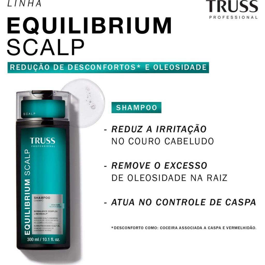 Shampoo Truss Equilibrium Scalp 300ml Benefícios: -Equilíbrio da oleosidade; -Hidratação das pontas; -Limpeza suave. Contém: -Shampoo Truss Equilibrium Scalp 300ml Clientes dizem: -“Excelente para cabelos mistos, limpa sem ressecar.” -“Deixa o couro cabeludo fresco e as pontas hidratadas.”