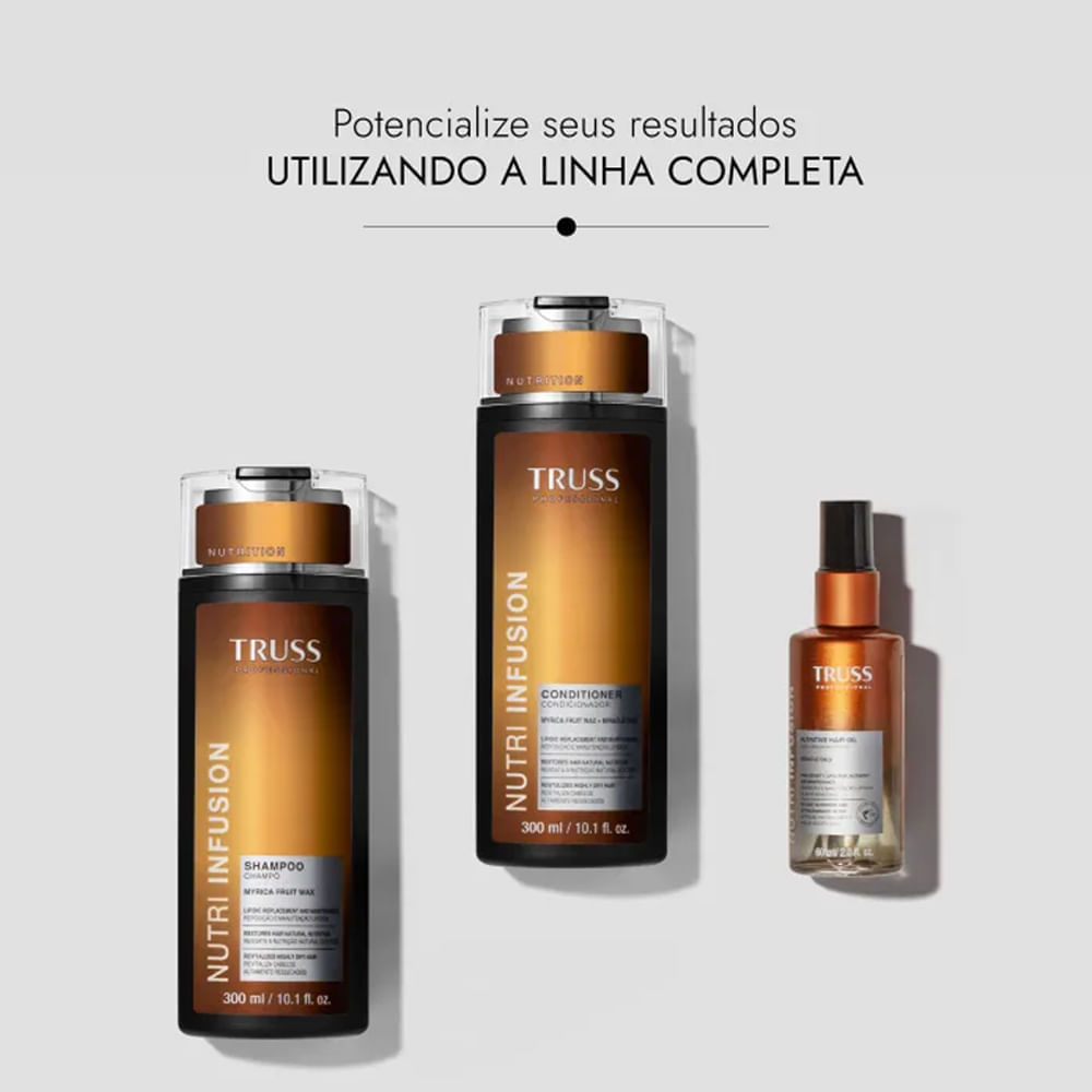 O Shampoo Truss Nutri Infusion 300ml é a escolha perfeita para profissionais e consumidores que buscam uma limpeza suave e eficaz para cabelos desidratados. Com fórmula exclusiva enriquecida com Myrica Fruit Wax e o poderoso complexo Miracle Oils, o produto atua na revitalização dos fios, formando uma película protetora contra o ressecamento e devolvendo o brilho, a saúde e a nutrição natural dos cabelos. Sua espuma cremosa remove delicadamente as impurezas, respeitando a fibra capilar e preparando os fios para tratamentos posteriores. Ideal para cabelos extremamente secos ou danificados, este shampoo profissional promove um verdadeiro tratamento de beleza desde a lavagem. Benefícios principais:• Reposição e manutenção lipídica.• Nutrição profunda e duradoura.• Revitalização de cabelos altamente ressecados.• Fortalecimento e brilho saudável dos fios.• Fórmula profissional com espuma cremosa.• Indicado para uso em salão ou em casa. Ativos de destaque:• Myrica Fruit Wax: cria um escudo lipídico que protege e repara os fios.• Miracle Oils: blend de óleos nutritivos que restauram a elasticidade e o brilho do cabelo. Modo de Usar: Aplique o shampoo nos cabelos molhados e massageie suavemente com as pontas dos dedos. Deixe agir por 2 minutos e finalize. Se necessário, repita o processo. Sobre a marca: Nascida no Brasil e hoje presente em quase 40 países, a TRUSS é sinônimo de excelência em cuidados capilares. Com mais de 20 anos de história, a marca conquistou a confiança de consumidores exigentes e profissionais da beleza, graças à sua expertise em desenvolver produtos de alta performance com ingredientes de última geração. • Transforme o cuidado diário em um verdadeiro tratamento de salão.