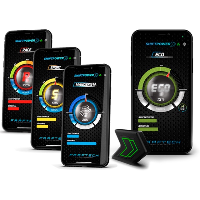 PRODUTO COM 3 ANOS DE GARANTIA PELO FABRICANTE FAAFTECH! O que é o Shiftpower e o que ele faz? O SHIFTPOWER é um dispositivo que remove o lag e melhora a resposta do acelerador eletrônico, ele é capaz de remover até 100% o atraso do acelerador, deixando o carro com uma resposta muito mais direta. O objetivo é obter uma experiência de direção aprimorada e segura, melhora a resposta do motor, limita a aceleração e bloqueia o pedal no modo anti-roubo. A instalação é rápida e segura sendo 100% Plug & Play, permitindo manter todos os recursos originais do veículo quando desinstalado, não deixando nenhuma falha no sistema original do carro. MODOS DE CONDUÇÃO • DYNAMIC Resposta suave, ganho confortável de cedil;ão. Indicado para uso na cidade. • SPORT Resposta média-rápida. Indicado para uso na cidade. • SUPER SPORT Resposta rápida com tocada mais esportiva. Indicado para uso em rodovias. • RACE Resposta extremamente agressiva. Indicado para uso em rodovias, ideal para ultrapassagens rápidas. • MODO ECO O modo eco permite atenuar a resposta de aceleração, possibilitando maximizar a economia de combustível. Com respostas de aceleração mais suaves, esse modo atende tanto quem busca economia, quanto quem precisa diminuir a resposta de aceleração, como para adolescentes, recém habilitados ou mesmo para uma direção mais segura em veículos muito potentes. Totalmente personalizável, pode ser ajustado para uma redução de até 20% na resposta, sem limitar a aceleração final do veículo. • MODO MANOBRISTA O modo manobrista limita o pedal do acelerador em 30% podendo ser ajustado entre 15 a 45% através do aplicativo, pode ser ativado tanto pelo App quanto pelo botão. Com o uso do App é possível configurar a saída automática por presença ao se aproximar do veículo. • MODO BLOQUEIO O modo bloqueio funciona como um dispositivo Anti-Furto anulando a resposta total do acelerador. Também pode ser ativado pelo aplicativo e pelo botão. Assim como no modo Manobrista também é possível configurar a saída automática do modo Bloqueio por presença. • AJUSTE DOS MODOS DE CONDUÇÃO Os modos de condução Dynamic, Sport, Super Sport e Race podem ser configurados pelo App para ter uma resposta personalizada com acesso rápido pelo botão. • MAPAS DE PERFORMANCE Além das opções de ganho e de Modos, as curvas de resposta podem ser selecionadas entre Linear, Dinâmico e Exponencial, totalizando mais de 300 opções para sua performance. Características • Possui aplicativo para o máximo de personalização • Resposta imediata de aceleração • Maior prazer ao dirigir • Ultrapassagens mais seguras • Direção mais esportiva • Fácil instalação (conecte e acelere sem nenhuma programação) • Plug and play (Não altera a originalidade do carro) • Disponível para mais de 290 modelos • Total personalização com mais de 300 mapas de performance.? • Opção de desativação dos modos Manobrista e Bloqueio por presença.* • Ajuste automático ou manual da iluminação do botão para os modos dia e noite.* • Configuração de limites para o modo manobrista. *(Desde que o Bluetooth esteja conectado e o App ativo). Especificações • Bluetooth integrado • Aplicativo disponível para IOS e Android • Aplicação somente em carros com acelerador eletrônico • Instalação Plug and Play • Produto 100% nacional • Elimina atraso do Acelerador Eletrônico em um toque • Instalção simples e rápida • Melhor resposta em redução de marchas • Ultrapassagens mais seguras • Melhores arranques em subidas • Mais diversão ao dirigir • Vários modos de condução • Modo bloqueio • Super compacto Itens Inclusos • 01 Interface • 01 Botão Seletor • 01 Chicote de Instalação • 02 Abraçadeiras de 15cm • Manual do usuário