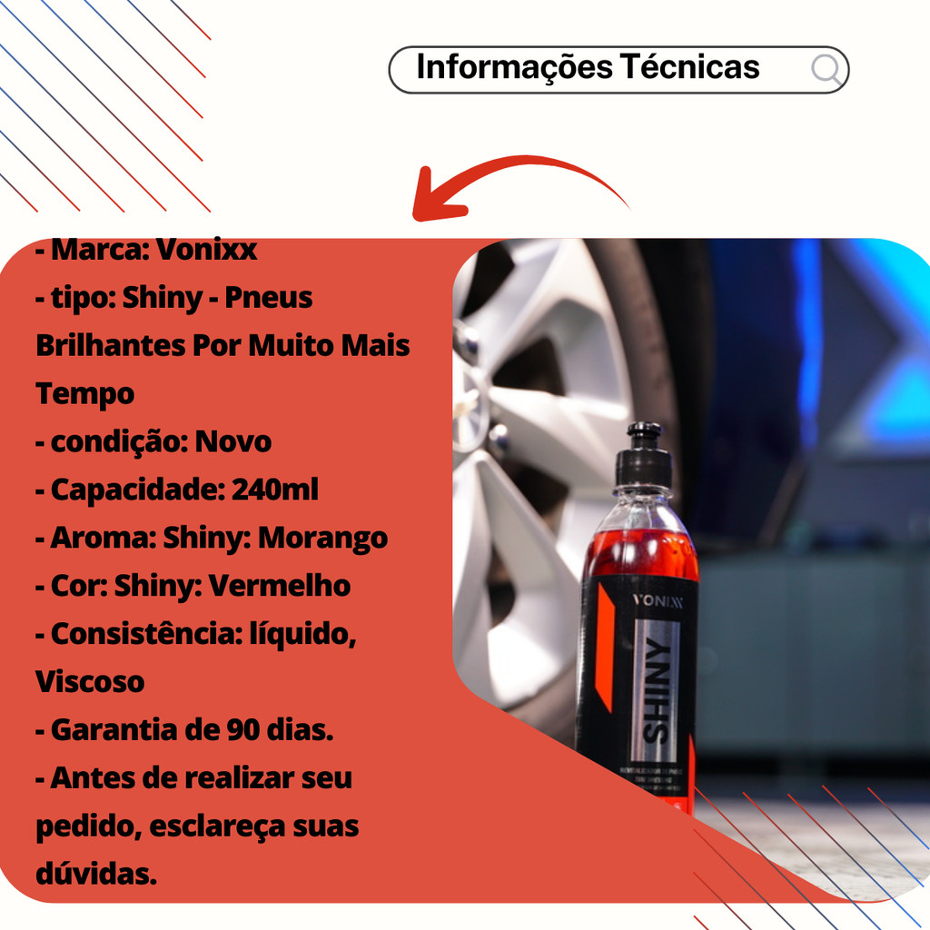 🎉 Bem-vindo! Você está em uma loja especializada em soluções automotivas seguras e confiáveis. Aqui, cada detalhe é pensado para cuidar do que move você: sua família, sua segurança e seus melhores momentos na estrada. 🛞✨ Shiny 240ml – Pneus Brilhantes Por Muito Mais Tempo O Shiny Vonixx é o produto ideal para manter a beleza e o brilho dos pneus do seu veículo. Desenvolvido exclusivamente pela Vonixx, sua fórmula única protege e revitaliza a borracha, mantendo o brilho por muito mais tempo. Fácil de aplicar, o Shiny é a escolha perfeita para quem deseja pneus sempre renovados, com acabamento intenso e sem esforço físico. Experimente e veja a diferença no visual do seu carro 🚘🔥 🔎 Referências Compatíveis 35487 2051026 📦 Informações do Produto 🏷️ Marca: Vonixx 🧴 Tipo: Shiny – Brilho para Pneus ✨ Condição: Novo 💧 Capacidade: 240ml 🍓 Aroma: Morango 🎨 Cor: Vermelho 🧪 Consistência: Líquido / Viscoso 🛡️ Garantia: 90 dias ❓ Antes de realizar seu pedido, esclareça suas dúvidas. 🚗 Aplicações 🛞 Produto desenvolvido exclusivamente para pneus de veículos 🔒 Protege, revitaliza e realça o brilho da borracha ✨ Ideal para acabamento estético e manutenção do visual ⭐ Principais Características ✨ Brilho intenso e duradouro ⏳ Proteção de até 60 dias 💦 Não sai com água 🔄 Rende de 15 a 20 aplicações 🎨 Realça a cor e o brilho original do pneu 🧽 Modo de Usar 1️⃣ Limpe bem a superfície do pneu 2️⃣ Aplique o produto com um aplicador de espuma 3️⃣ Espalhe até a completa revitalização 4️⃣ Se necessário, repita a operação 🛒 Adquira agora o Shiny 240ml – Pneus Brilhantes Por Muito Mais Tempo em uma de nossas Lojas Oficiais: ✔️ Camillo Parts ✔️ Genuine Automotive ✔️ Edumac Parts Produto original, qualidade garantida e suporte que você merece 🤝✨ ⚠️ Aviso Legal Proibimos o uso, cópia ou alteração de nossas fotos, imagens e conteúdos presentes nos anúncios. Conforme a Lei nº 9.610/98, qualquer violação será tratada legalmente, pois possuímos direitos autorais sobre este material.
