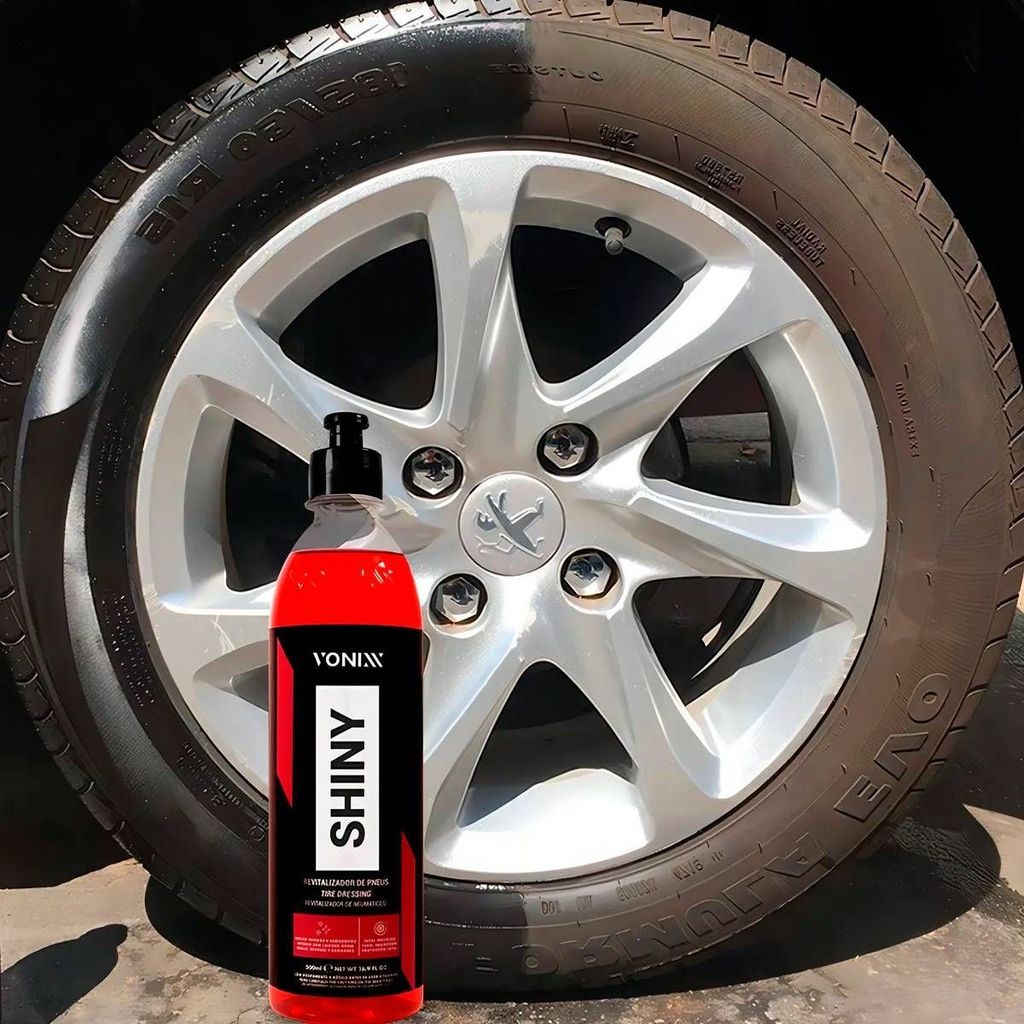 SHINY 500ML VONIXX DESCRIÇÃO: SHINY é um produto desenvolvido exclusivamente para uso em pneus que renova, protege e dá brilho intenso e duradouro aos pneus. O produto não sai ao entrar em contato com a água, podendo alcançar durabilidade de até 60 dias, rende de 15 a 20 aplicações em carros pequenos e mantendo o aspecto no pneu de brilho molhado. MODO DE USO: • 1 - Limpar bem a superfície e em seguida aplicar o produto com um aplicador de espuma até a completa revitalização. Se necessário repetir a operação.