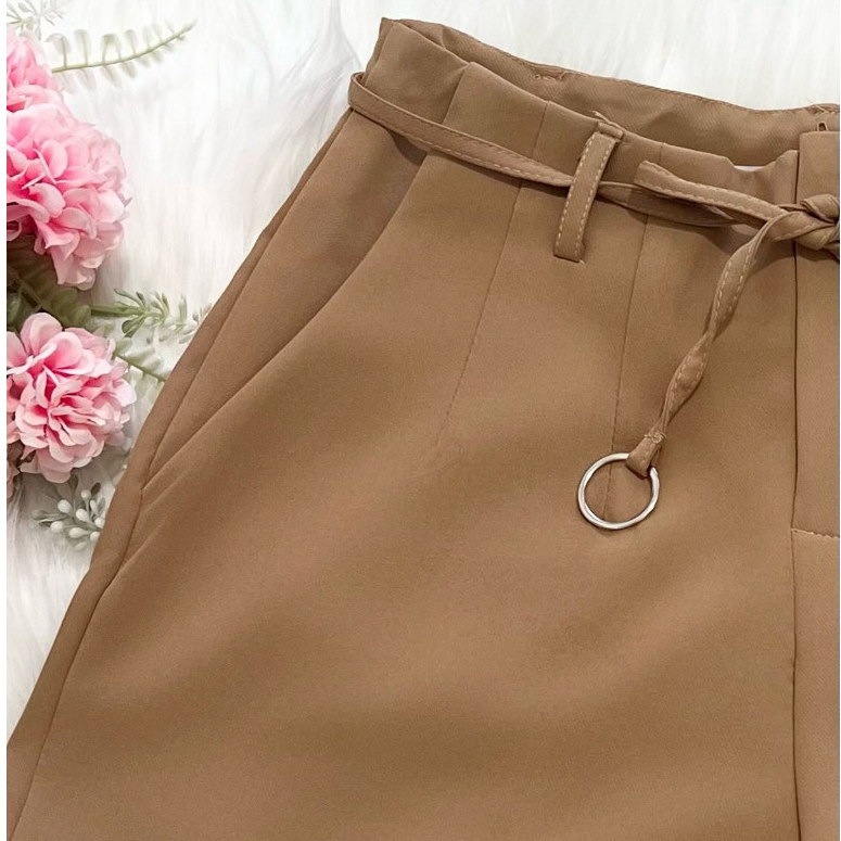 Short Alfaiataria Feminino Cintura Alta Bolsos Lateral Com Cinto detlhes em Argola Casual/ Chic