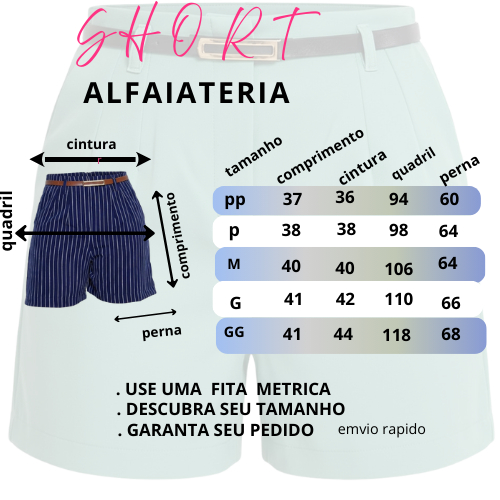 Transforme seu visual com o nosso Short zara Listrado Feminino, que combina elegância e conforto. Com dois bolsos e zíper lateral, a peça é perfeita para quem busca um toque moderno no dia a dia. esta bermuda elegante com desejo moderno vai deixar seu look perfeito. bermuda feminina Feita em tecido alfaiataria listrada com 95% poliéster e 5% elastano, é ideal para diferentes tamanhos: - PP(36)-P (38) - M (40) - G (42) - GG (44) Não perca a chance de brilhar com estilo! Tamanho PP : • Cintura: 36 cm • Quadril: 94 cm • Comprimento: 37 cm . coxa 60 cm Tamanho P : • Cintura: 38 cm • Quadril: 98 cm • Comprimento: 38 cm . coxa 64 cm Tamanho M : • Cintura: 40 cm • Quadril: 106 cm • Comprimento: 40 cm . coxa 64 cm Tamanho G : • Cintura: 42 cm • Quadril: 110 cm • Comprimento: 41 cm . coxa 66 cm Tamanho GG : • Cintura: 44 cm • Quadril: 118 cm • Comprimento: 41 cm . coxa 68 cm boas compras