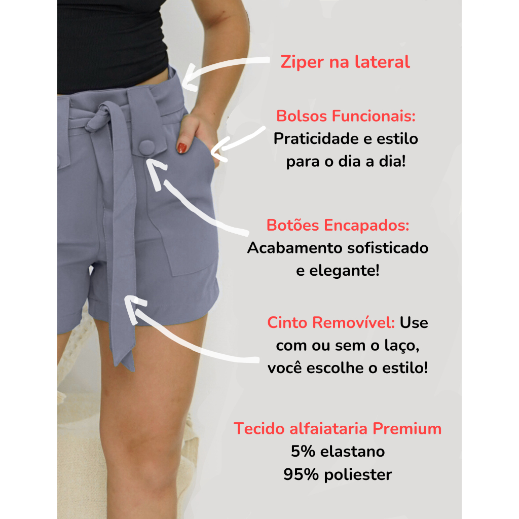 Short feminino em tecido Alfaiataria Premium, com ótimo caimento e tecido de qualidade! 📌AS FOTOS DO ANÚNCIO SÃO FOTOS REAIS DO PRODUTO! 📌Composição: 5% elastano 95% poliester 📌Laço pode ser removido ✅TAMANHOS E MEDIDAS: 🌸 M - veste 38 *Cintura (circunferência): 74-76 cm / *Quadril: 94cm /Comprimento: 36cm 🌸 G - veste 40 *Cintura (circunferência): 78-80 cm / *Quadril: 98cm / Comprimento: 38cm 🌸 GG - veste 44 *Cintura (circunferência): 88 cm / *Quadril: 104cm / Comprimento: 40cm ✅ DESTAQUES: •Botões encapados •Tecido Alfaitaria Premium •Com Laço •Possui Bolso •Ziper na lateral INFORMAÇÕES IMPORTANTES: 1. Entre Rápida 3. Antes de finalizar o seu pedido, VERIFIQUE se o seu ENDEREÇO de entrega está cadastrado corretamente. 🌟EM CASO DE DÚVIDAS NOS ENVIE UMA MENSAGEM🌟