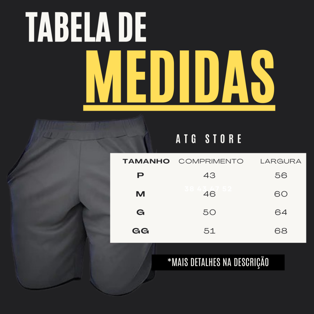 ****ENVIO TURBO EM 24 HORAS**** CARACTERÍSTICAS DO PRODUTO: • Tecido leve e de secagem rápida • Pode ser usada em qualquer ocasião • Ideal para praticar atividade física em geral • NÃO encolhe • NÃO perde a cor INSTRUÇÕES DE LAVAGEM: • Lavar somente a mão • Não usar alvejante a base de cloro • Não secar na secadora • Não lavar a seco • Não passar Ferro GUIA DE TAMANHOS: Em caso de dúvida em relação ao tamanho, verifique o guia de tamanhos do anúncio e compare com uma peça de seu guarda-roupa. Tamanho M: (veste 38) 46cm de comprimento, 60cm de coxa, 60cm cintura relaxada e 118cm cintura com elástico totalmente esticado (Possui elástico) Tamanho G: (veste 40/42) 50cm de comprimento, 66cm de coxa, 64cm cintura relaxada e 134cm cintura com elástico totalmente esticado (Possui elástico) Tamanho GG: (veste 44/46) 51cm de comprimento, 70cm de coxa, 68cm cintura relaxada 139cm cintura com elástico totalmente esticado (Possui elástico) *Medidas de cada tamanho podem ter variação de até 2cm. Qualquer dúvida, estamos à disposição.