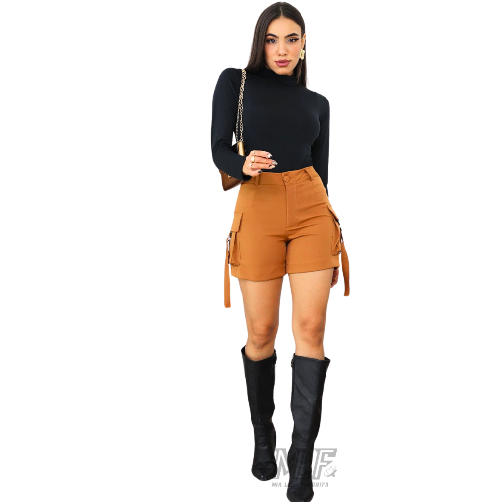 Short Cargo Alfaiataria Feminina Bolso Lateral Cintura Alta