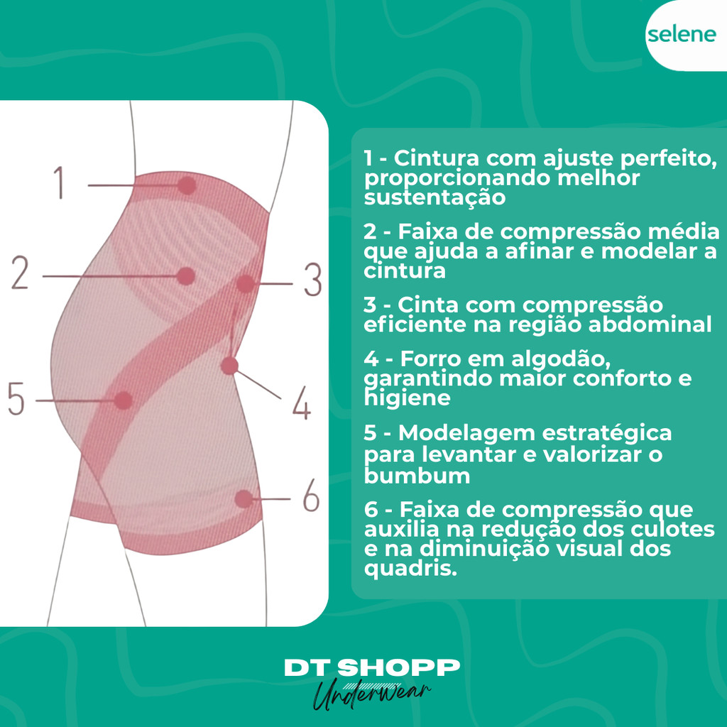Short Modelador Selene Feminino Conforto e Sustentação | Compressão Leve | Roupas Justas Short Modelador Selene Feminino Ref. 9815 Modelagem, conforto e liberdade para o seu dia a dia. O Short Modelador Selene foi desenvolvido com elastano de alta qualidade para oferecer compressão leve a média, garantindo sustentação e liberdade de movimento. Com modelagem anatômica, ele se ajusta perfeitamente ao corpo, valoriza as curvas e proporciona um caimento discreto sob qualquer tipo de roupa. Ideal para o uso diário, é aquele tipo de peça que une conforto, segurança e praticidade — perfeita para quem busca suavizar o contorno da cintura e evitar o atrito entre as coxas. Benefícios principais - Compressão leve a média, modela sem apertar - Sustentação e firmeza no abdome e quadril - Tecido com toque macio e alta respirabilidade - Modelagem anatômica que valoriza as curvas - Comprimento médio nas pernas, evita atrito entre as coxas - Ideal para usar sob roupas justas e vestidos - Liberdade total de movimentos Detalhes técnicos Marca: Selene Referência: 9815 Composição: 86% Poliamida, 14% Elastano Tamanhos disponíveis: P | M | G | EG Tipo: Short modelador feminino Origem: Produto original Selene Feito no Brasil Tecnologia e conforto Selene Desenvolvido com microfibra de compressão inteligente, o Short Modelador Selene garante ajuste perfeito ao corpo sem restringir o movimento. Seu tecido é leve, respirável e mantém a firmeza mesmo após várias lavagens. Por que escolher o Short Modelador Selene É a peça ideal para o dia a dia — desde o trabalho até ocasiões especiais. Ajuda a manter a postura, reduz o atrito e suaviza o contorno corporal sem desconforto. Com ele, você se sente segura, elegante e livre o tempo todo. Entrega garantida Produto 100% original Selene Envio imediato com nota fiscal Itens inclusos 1 Short Modelador Selene Ref. 9815 Perguntas Frequentes – Short Modelador Selene 9815 A compressão é muito forte? Não. O short possui compressão leve a média, modelando com conforto e sem apertar. Posso usar o dia todo? Sim. O tecido é respirável e o design anatômico permite uso prolongado sem incômodo. Ele marca sob a roupa? Não. O acabamento é discreto e sem costura aparente, ideal para usar sob roupas justas. Serve para evitar atrito entre as coxas? Sim. O comprimento médio cobre a parte interna das coxas e evita o atrito durante o movimento. É indicado para o calor? Sim. A microfibra é leve, respirável e mantém o conforto térmico mesmo em dias quentes. Pode ser usado para treino ou academia? Pode, desde que o objetivo seja sustentação leve. É ideal para caminhadas e atividades moderadas. O produto é original Selene? Sim. Produto 100% original, com nota fiscal e garantia de procedência. Dúvidas? Pergunte ao Urso logo abaixo que te ajudamos.