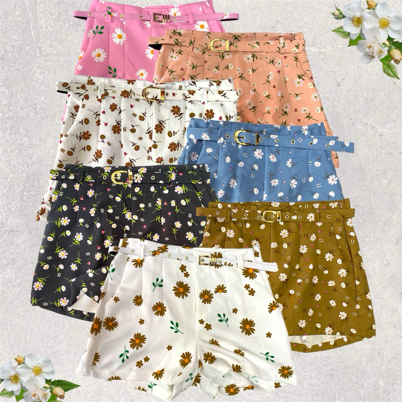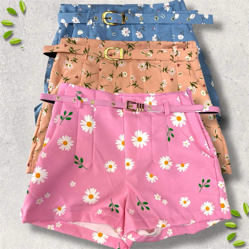 Short Feminino Alfaiataria Estampado Floral Com Cinto