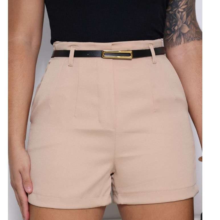Short feminino alfaiataria lizo social cintura alta com zíper na lateral bolsos funcionais acompanha cinto verão