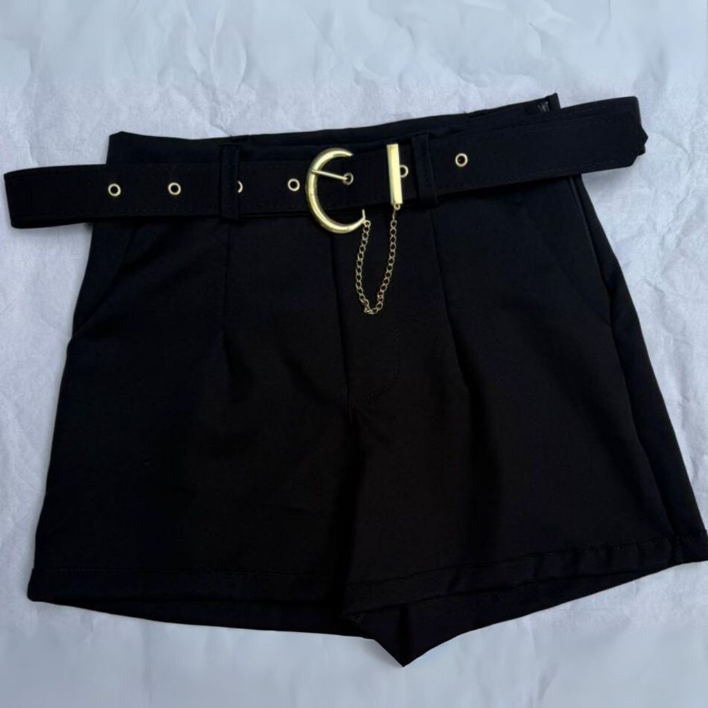 Short Feminino com Cinto Fivela Dourado, Bolsos, Zíper em Tecido Alfaiataria - Disponível em Diversas Cores