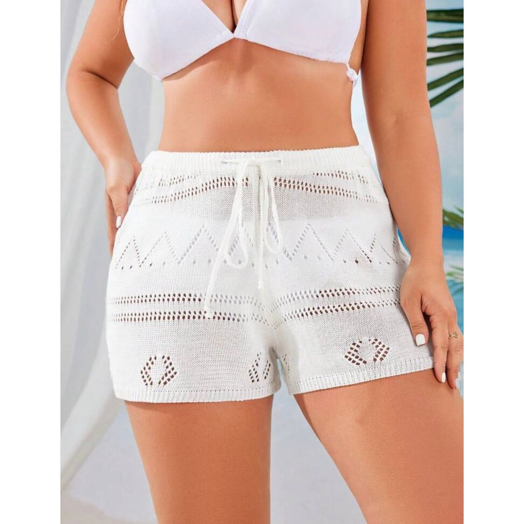 Short Feminino Saida de Praia Shortinho Tricot Crochê Com Cós com cordão para regulagem