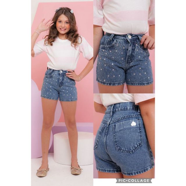 Short Jeans Cintura Alta Infantil Juvenil Strass - 8 Ao 16