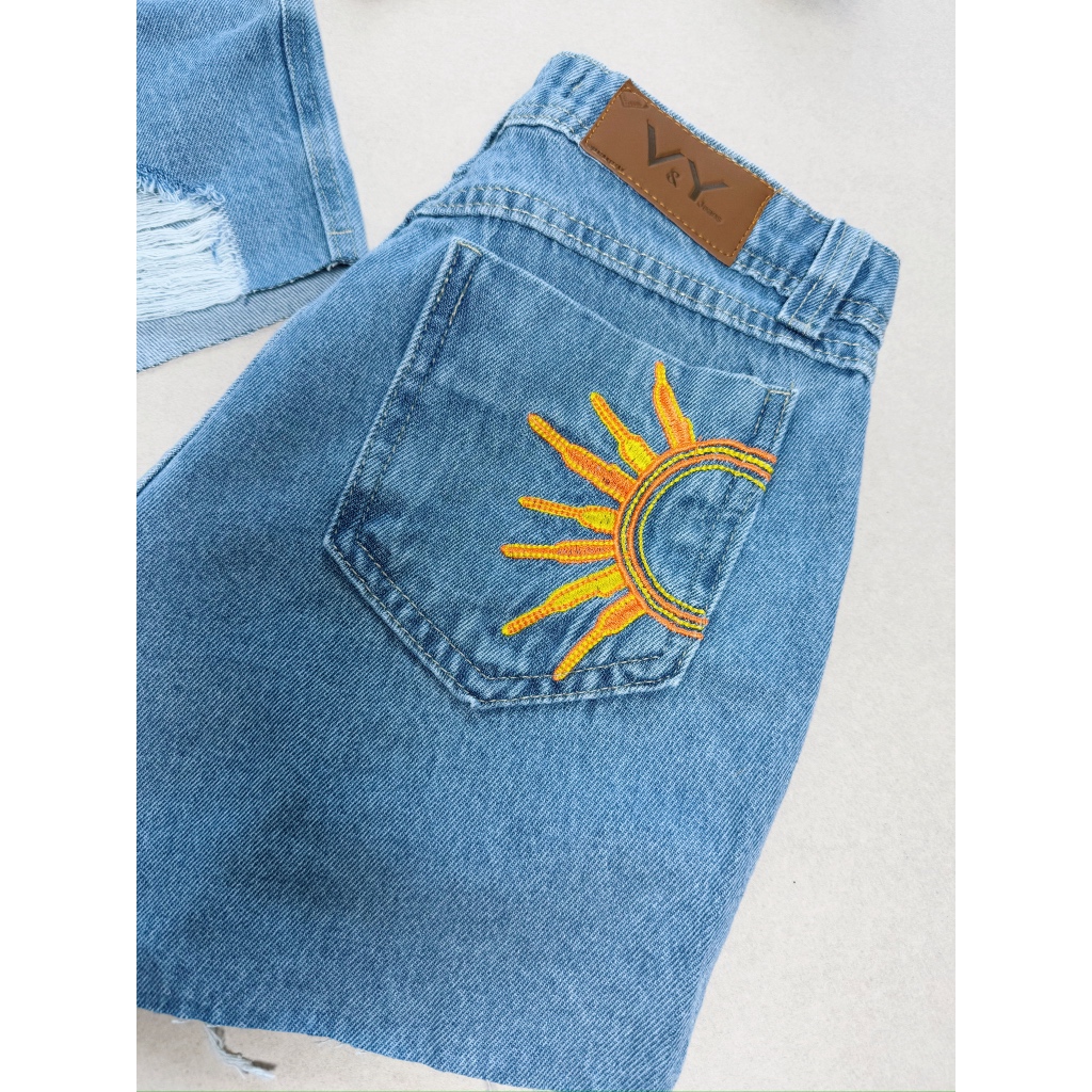 Short Jeans Feminino Bordado Bolso Traseiro Siga o Sol Com Bolso