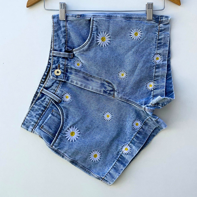 Short jeans feminino cintura alta bordado margarida