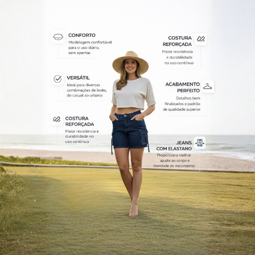 CARACTERÍSTICAS DO PRODUTO Jeans 100% Algodão Tecido encorpado, resistente e confortável, com toque firme e excelente durabilidade. Ideal para quem busca estrutura, qualidade e visual mais robusto. Tecido Confortável e Respirável Mesmo sendo encorpado, o jeans 100% algodão permite boa ventilação, garantindo conforto para o uso diário. Costuras Reforçadas Acabamento reforçado que proporciona maior resistência, durabilidade e segurança no uso contínuo. Modelagem Meia Coxa Cargo Comprimento ideal que oferece conforto, segurança e um visual moderno, valorizando a silhueta sem apertar. Bolsos Cargo Funcionais Possui bolsos laterais cargo e bolsos tradicionais, todos funcionais, trazendo praticidade e estilo ao dia a dia. Cintura Alta Garante melhor ajuste ao corpo, mais firmeza ao vestir e valorização da região da cintura. Acabamento Perfeito Visual bem estruturado, com excelente padrão de confecção e fácil de combinar com diferentes estilos. POR QUE ESCOLHER ESSE SHORT JEANS CARGO MEIA COXA? Short jeans cargo feminino meia coxa Confeccionado em jeans 100% algodão Estrutura firme e confortável para uso diário Modelagem moderna e versátil Bolsos cargo funcionais Costuras reforçadas Alta durabilidade e ótimo acabamento Ideal para looks casuais, urbanos e do dia a dia Combina com blusinhas, camisetas, croppeds, camisas, sandálias, tênis ou salto DICA DE TAMANHO Consulte a tabela de medidas disponível nas imagens do anúncio para escolher o tamanho mais adequado. PERGUNTAS FREQUENTES O short possui elastano (lycra)? Não. O modelo é confeccionado em jeans 100% algodão, garantindo estrutura, resistência e visual mais encorpado. O short aperta ou limita os movimentos? Não. A modelagem cargo meia coxa oferece conforto e liberdade de movimento. Os bolsos são funcionais? Sim. Possui bolsos laterais cargo e bolsos tradicionais, todos funcionais. Pode ser usado no dia a dia? Sim. Indicado para uso diário, passeios, trabalho informal e momentos de lazer. Qual o tipo de cintura? Cintura alta, que oferece melhor ajuste, segurança e conforto ao vestir. Short Jeans Cargo Meia Coxa Feminino 100% Algodão Uma peça resistente, versátil e moderna para quem busca conforto, praticidade e estilo no dia a dia.