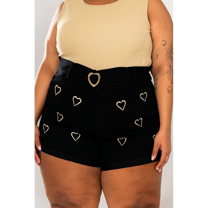 Short Jeans Lycra Plus Size Feminina cintura alta botão encapado bordado cinto