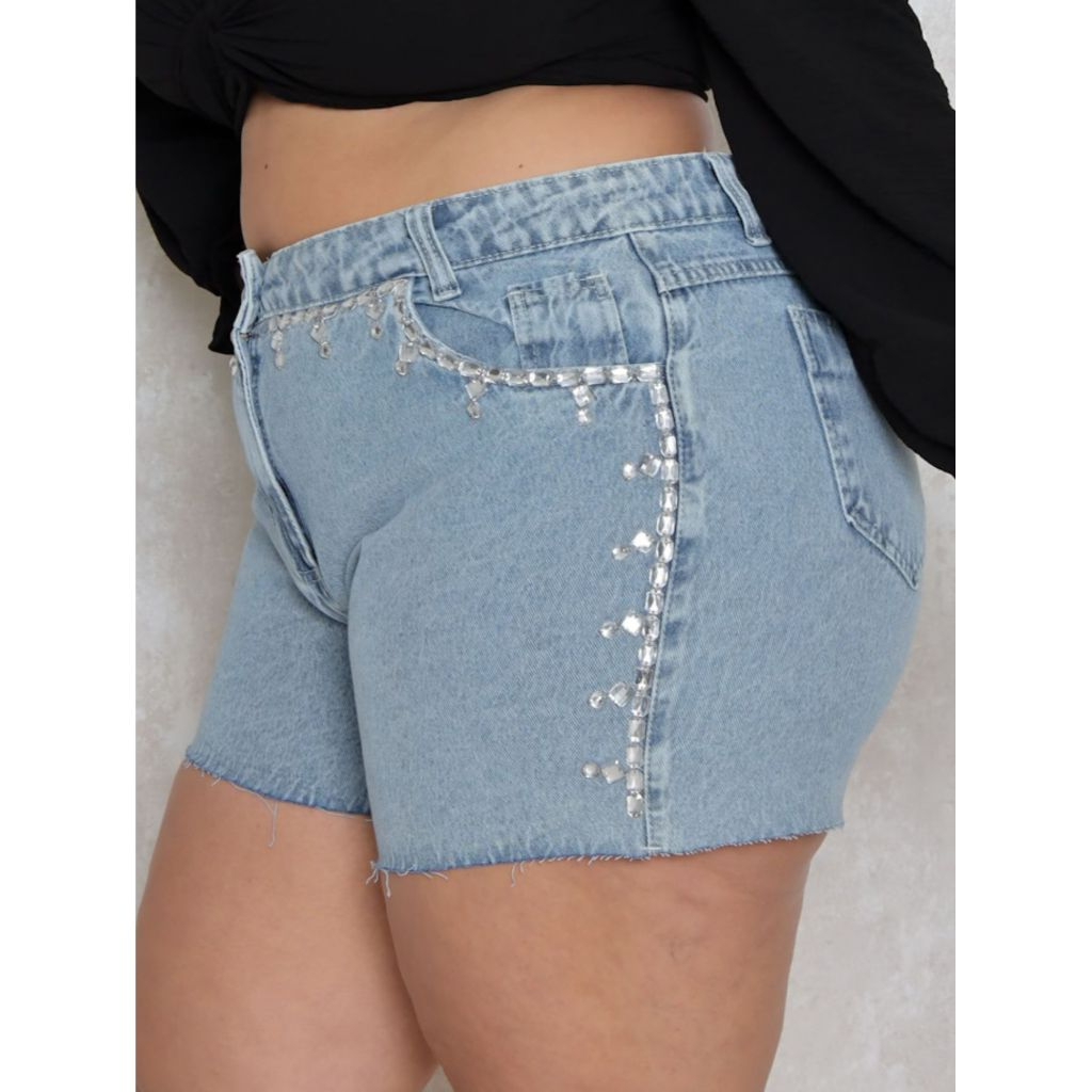 SHORT JEANS PLUS SIZE FEMININO COM PEDRARIA COM BOLSOS