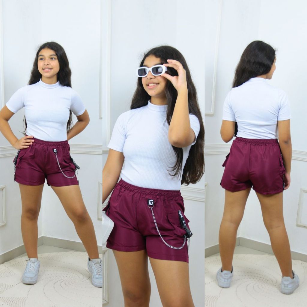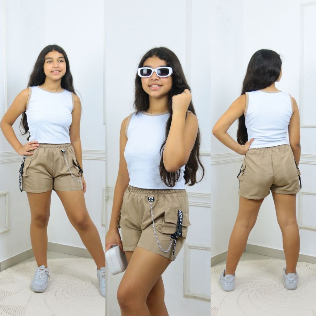 Short Juvenil Cargo Tactel com Corrente feminino Moda Streetwear – 2 Bolsos Funcionais