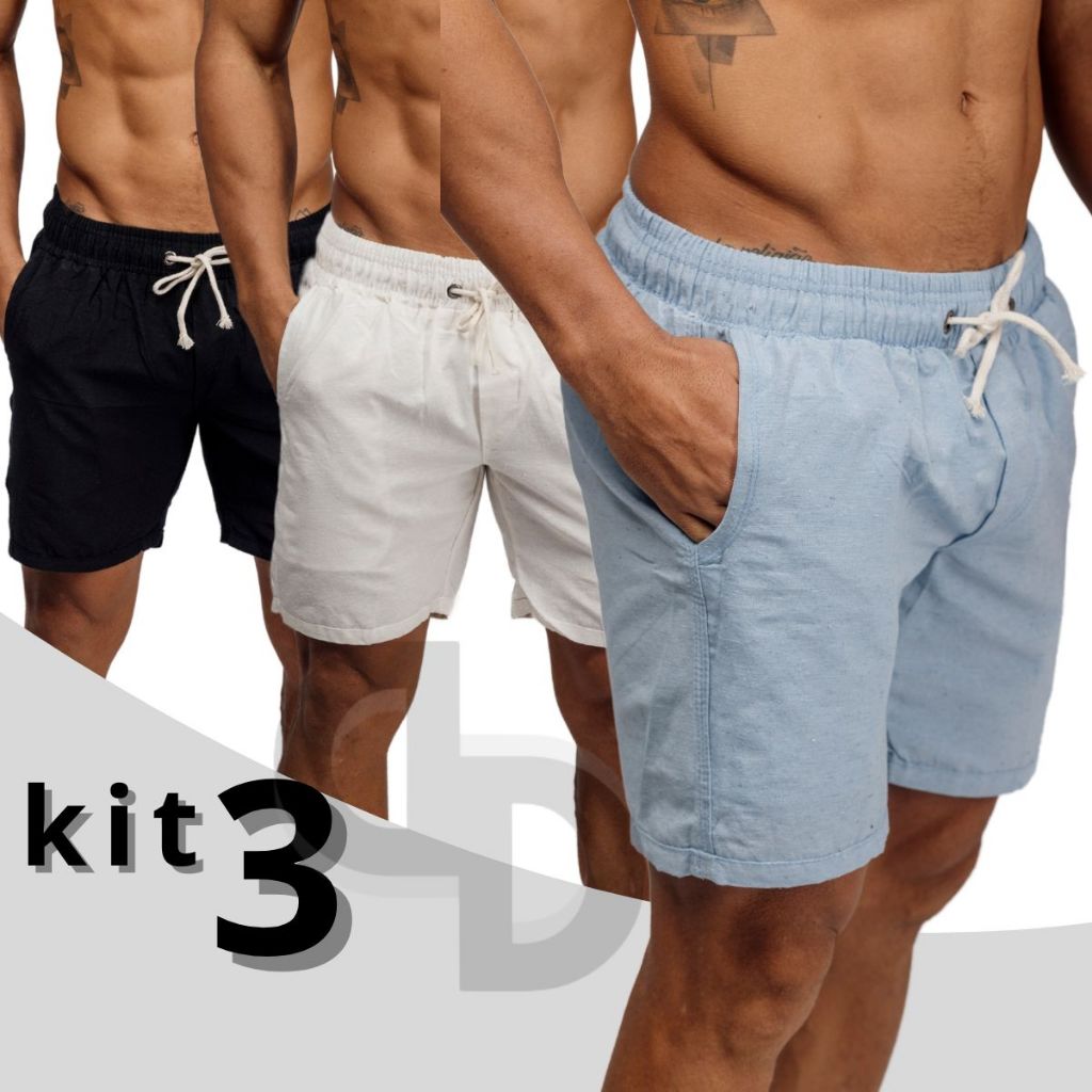 Short Linho Kit 3 Bermudas Mauricinho Premium Basico Casual Masculino