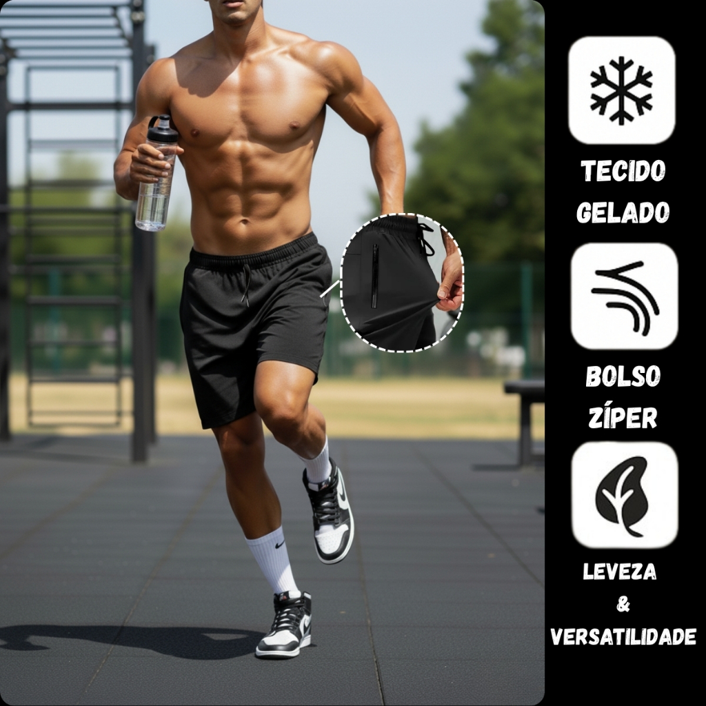 Short Para Futebol Corrida e Academia Em Poliamida, Bermuda Com Cordão e 2 Bolsos Ziper