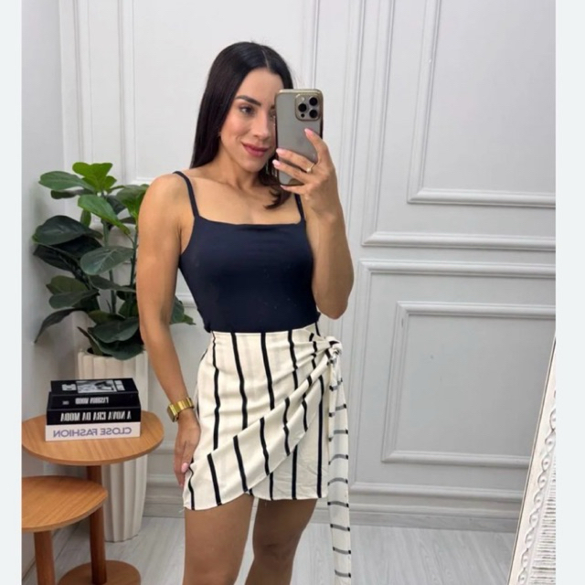 Short saia em linho listrado tendência de 2026 vem com tudo. TECIDO LINHO - CONTÉM AMARRAÇÃO - CONTÉM ELÁSTICO NO CÓS