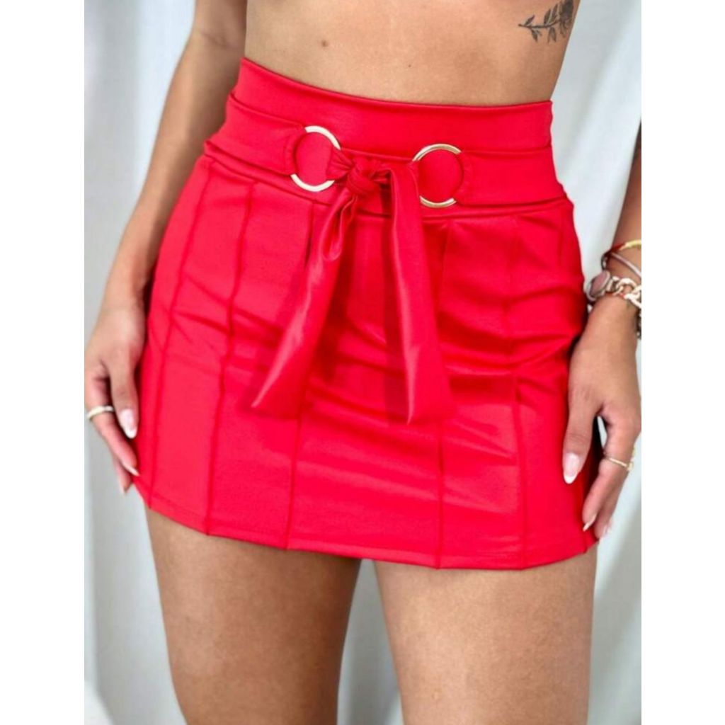 Short Saia Couro Fake Ecológico Preto com Cinto Argola Feminino