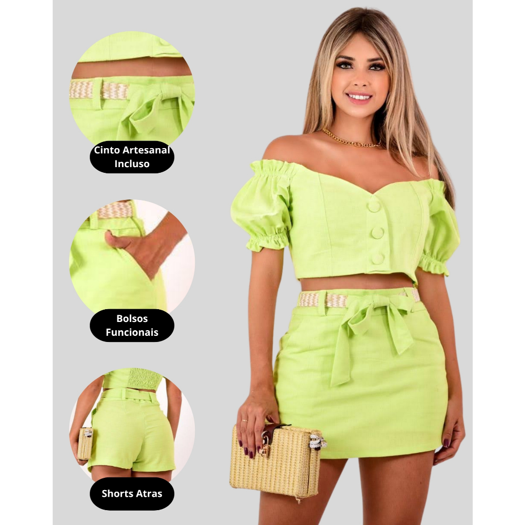 SHORTSAIA (SKORT) EM LINHO – COM CINTO DE PALHA INCLUSO Conforto de short com a elegância da saia. Modelagem em linho com cintura alta, short interno que não marca, e cinto trançado removível para ajustar a silhueta. Destaques ✨ Cinto incluso (removível) 🩳 Short interno: segurança para se mover sem transparência 🧵 Tecido: linho (misto) de toque fresco, ideal para o dia a dia 🔝 Cintura alta que valoriza 🧶 Acabamento pensado para revendedoras e uso intenso Tamanhos (corpo em cm) P(38): Cintura 76 | Quadril 98 | Largura 35 M(40): Cintura 80 | Quadril 102 | Largura 36 G(42): Cintura 84 | Quadril 106 | Largura 37 (Tolerância de fabricação: ±1 cm. Ajuste fino pelo cinto.) Conteúdo da embalagem 1x Shortsaia em linho + 1x Cinto trançado (incluso) Cuidados Lavar do avesso, cores similares, não usar alvejante. Secagem à sombra para preservar a fibra. Envio & Trocas Envio em até 24h úteis após a confirmação. Troca/devolução dentro da política da plataforma. Dúvidas frequentes Tem transparência? Não — o short interno elimina essa preocupação. Serve em quadril mais avantajado? Veja o guia de medidas acima; se ficar entre dois tamanhos, escolha o maior e ajuste no cinto. O cinto vem junto? Sim, incluso.