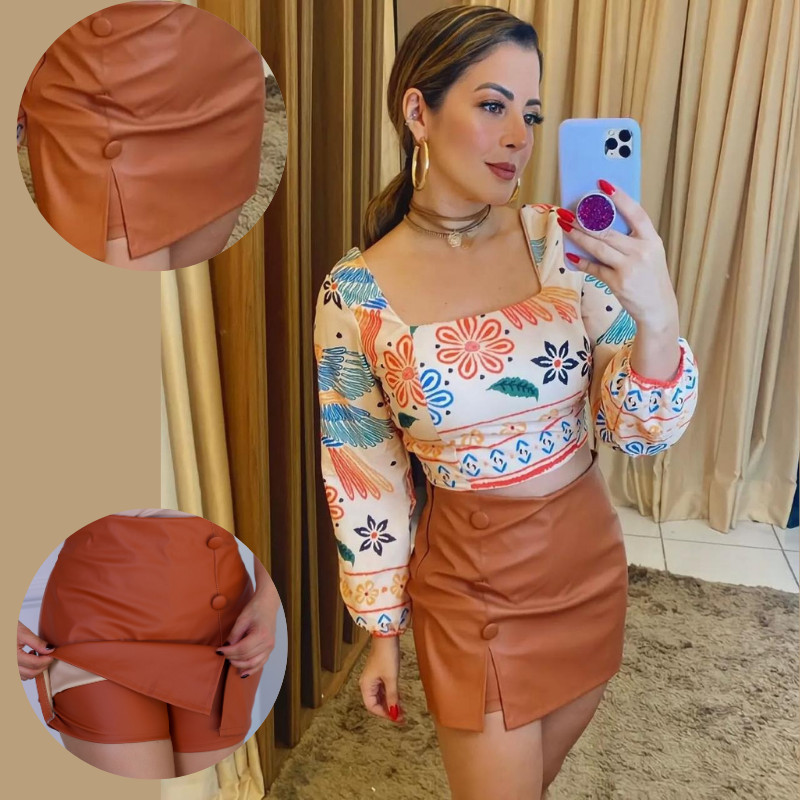 Short Saia Feminino Courino Cintura Alta Saia Couro Com Zíper Botões Forrado