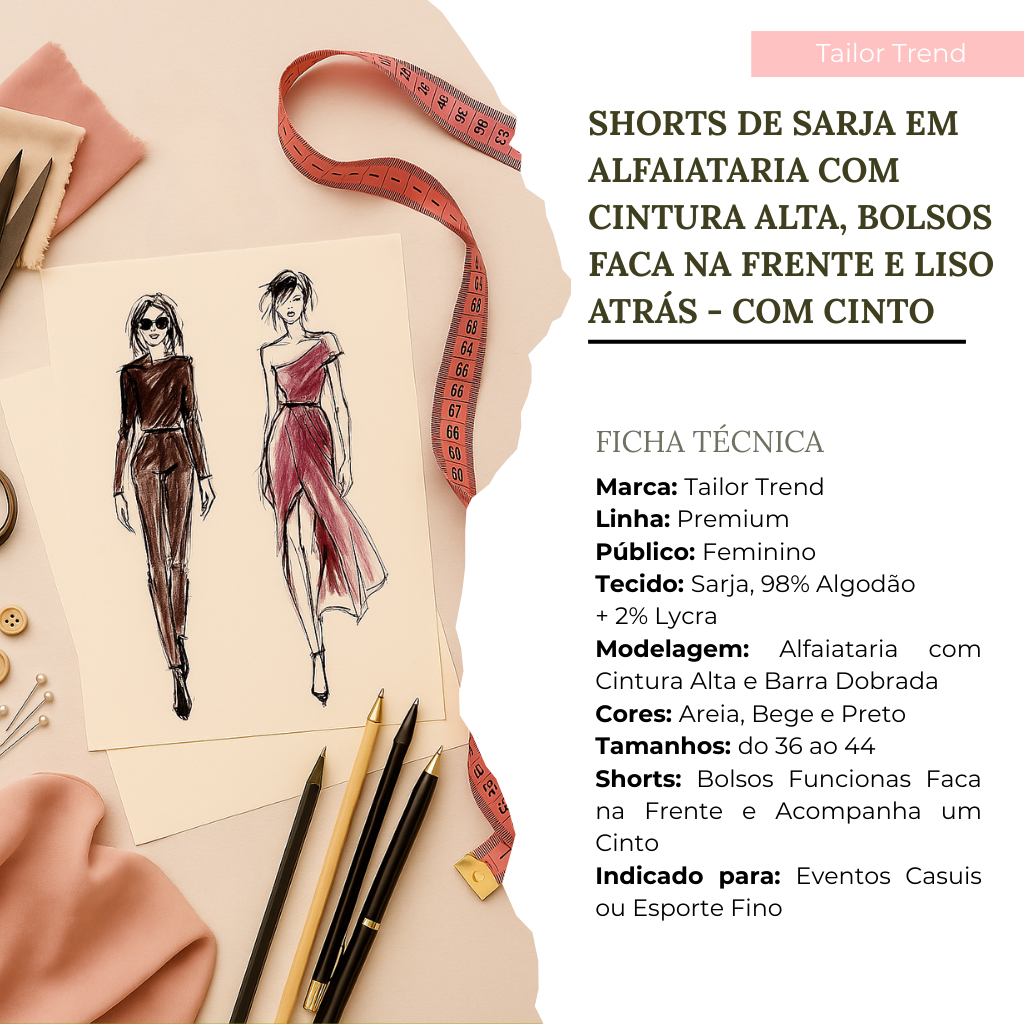 Elegância e conforto em uma única peça. O Shorts Feminino Arrumado de Sarja com Corte Alfaiataria foi desenvolvido para mulheres que valorizam estilo, caimento impecável e praticidade no dia a dia. Seu tecido premium com leve elastano oferece liberdade de movimento e um toque suave à pele, garantindo conforto o dia todo. Com cintura alta, barra virada e acompanhado de um cinto super estiloso, o modelo valoriza a silhueta e adiciona um toque sofisticado ao visual. Ideal para compor looks chiques ou casuais. É a escolha perfeita para o trabalho, passeios ou momentos de lazer. Perfeito para aquela viagem, dias quentes no parque ou calor na praia, com também para sair à noite para barzinhos, festas, baladas ou outros eventos. Destaques e Benefícios Tecido de qualidade premium: 98% algodão + 2% lycra (elastano) – firme, confortável e com toque macio • O tecido não marca e não mostra o que não deve, nem cria bolinha e nem desbota • Modelagem soltinha com cintura alta: define a cintura e alonga a silhueta e ajuda a disfarçar a barriga • Corte de alfaiataria: visual elegante com caimento impecável • Bolsos funcionais: tipo faca na frente e chapados atrás • Acompanha cinto: acabamento refinado • Barra dobrada: toque moderno e estruturado Cores disponíveis: bege areia com cinto marrom e fivela cor ouro fosco; bege off-sand com cinto marrom e fivela cor ouro fosco; e preto com cinto preto e e fivela cor chumbo. Tamanhos: do 36 ao 44 Por que Você Vai Amar Combina com camisas, regatas ou blusas de seda • Ideal para looks de trabalho, almoço ou passeio e sair à noite para barzinhos, baladas, festas e outros eventos • Tecido encorpado com lycra (elastano) com um toque macio feito pêssego no seu corpo • Versátil e atemporal — uma peça curinga no guarda-roupa Essa é a peça ideal para se manter bonita, valorizada e chic nos dias de calor no verão em qualquer ocasião, tanto as casuais quanto aquelas mais requintadas! Escolha sua cor favorita e sinta o caimento perfeito deste shorts feminino premium — conforto, elegância e versatilidade em cada detalhe! MEDIDAS DA MODELO - Ela veste o número 36 da cor areia e possui as seguintes medidas Cintura Alta: 75 cm Quadril: 100 cm IMPORTANTE: Fique atenta à tabela de medidas para comprar um tamanho de shorts que melhor se ajuste ao seu corpo. O shorts possui lycra na composição do tecido e um caimento soltinho, então se prefere que fique mais justo no corpo, compre uma numeração a menos (ex: pela tabela, você deveria comprar o 40, mas para obter um caimento mais justo do shorts, leve o 38). Qualquer dúvida, não hesite em entrar em contato pelo chat, pois teremos o maior prazer em atendê-la!